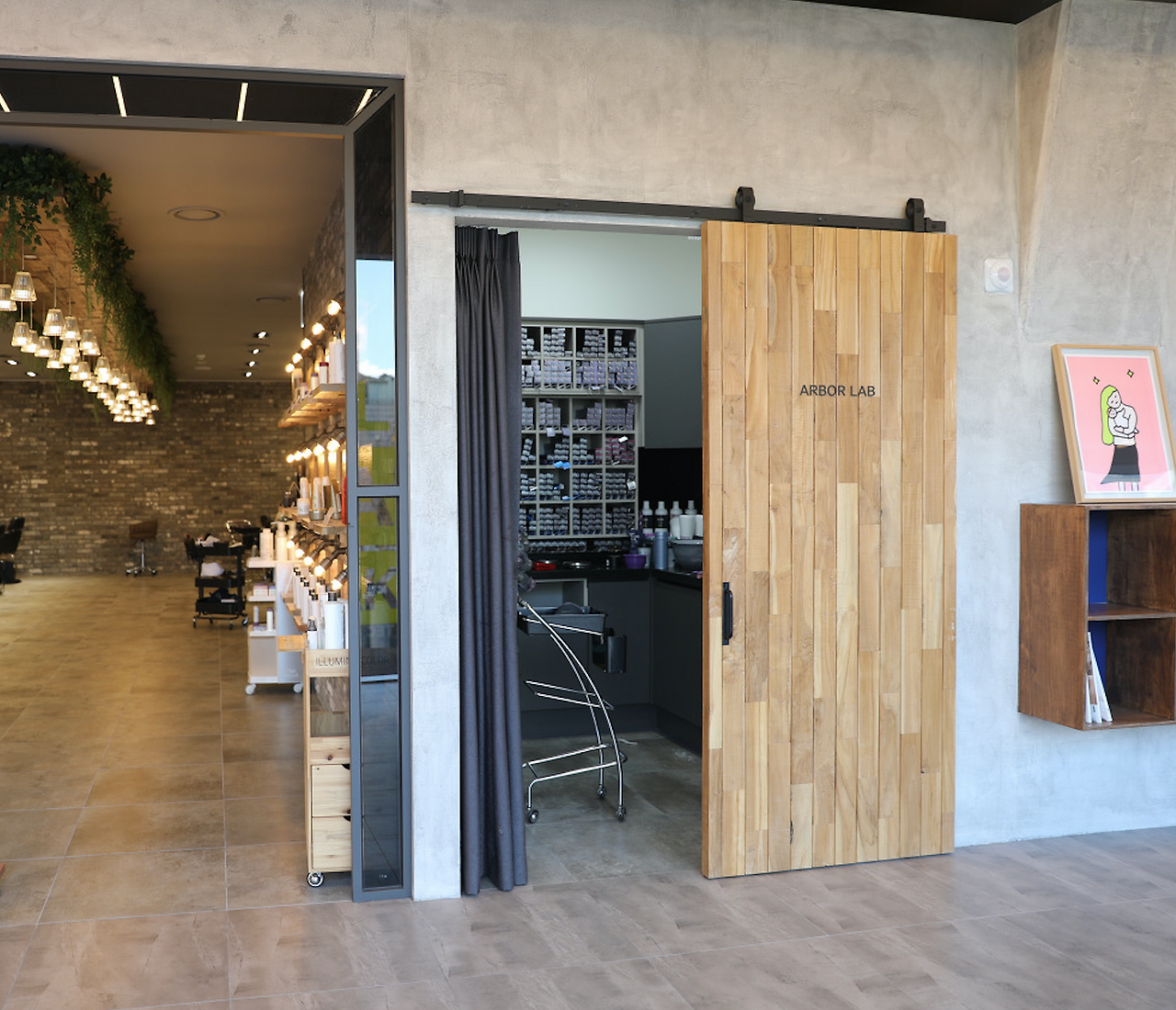 두번째 특별한 공간이 있다면 ARBOR LAB을 들 수 있겠네요. 제품을 실험하고 제조하는 공간으로 머리 자르는 곳과 분리되어 있어요. 기존의 헤어샵들은 어쩔 수 없이 고객들이 보는 앞에서 제조하는데 그것이 그다지 보기좋은 풍경은 아니라고 생각합니다. 마치 식당 테이블에서 주방을 보고있는 기분같은 것이죠. 그래서 아버는 공간 분리를 통해 좀 더 전문적이고 깔끔한 고급 서비스를 성취하고 있습니다.