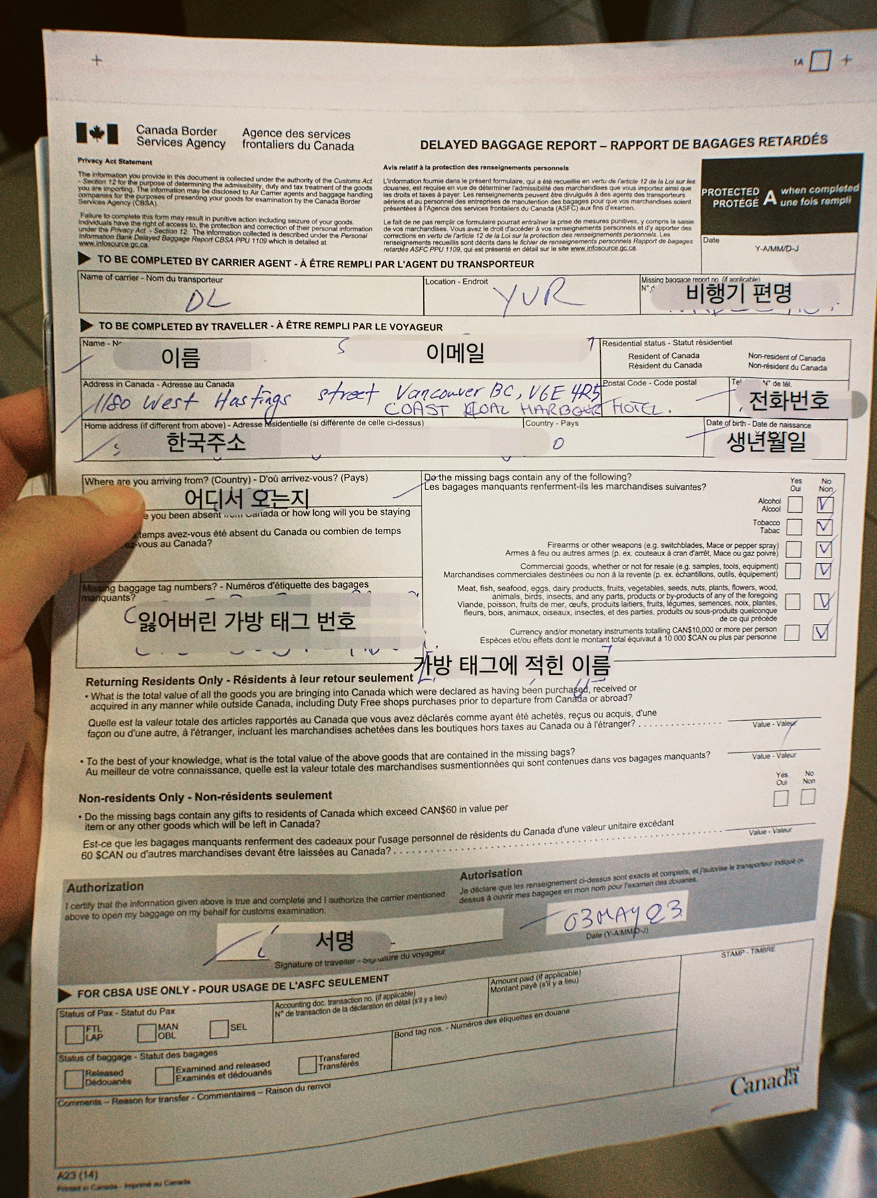 일단 직원이 따라오라고 해서 그곳으로 가니 시애틀에서 짐이 오지 않은 팀들이 우리 가족 말고도 꽤 있었다. 대기줄에 서있으니 직원분이 어떤 종이를 하나씩 준다. 거기에 이름과 캐나다에서 머무는 곳 주소, 우편번호, 전화번호, 생년월일, 집 주소, 잃어버린 짐 번호를 적게 되어있었다. 일단 적어 달라고 해서 ‘이게 뭔 dog 같은 상황인가’라고 생각하며 정신없이 써내려갔다. 우리는 밴쿠버에 있는 ‘Coast Coal Harbour Vancouver Hotel’에 머물 예정이었기 때문에 호텔 주소를 작성했다. 한국 주소 또한 여행을 준비하면서 영문으로 여러 번 봤던 기억이 있어서 순조롭게 작성했다. 그러고 나서 사무직원에게 제출하며 이런 저런 대화를 했다. 살려고 하니 영어도 나름 막힘없이 나왔다. 지금 와서 생각해 보면 어떤 느낌이었냐. 노트북에서 무거운 프로그램을 쓰다 보면 윙~ 하고 소리가 나며 과열될 때가 있다. 딱 내 뇌가 그런 느낌이었다. 안 쓰던 영어를 갑자기 살기 위해 하자니 내 뇌가 윙~ 하고 돌기 시작했다. (아이고 두야.) 언제쯤 받을 수 있는지 물었더니 시애틀에서 오는 다음 뱅기가 오후 6시 반이기 때문에 도착해서 우리가 있는 호텔로 보내면 오후 8시쯤에는 받을 수 있을 거라고 했다. 옆에서 어머니는 우리의 짐이 시애틀에 있는 거긴 하냐고 물어보라고 한다. (짬에서 나오는 질문..!)