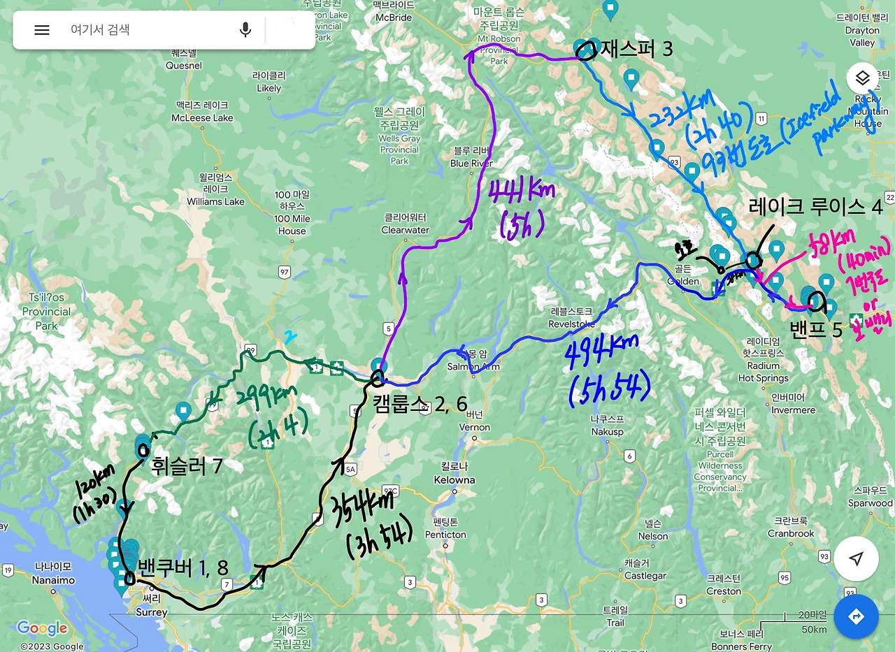 로키여행을 갈 때는 구글맵에 미리 지도를 다운받아가야 한다. 캠룹스~재스퍼, 재스퍼~밴프, 밴프~캠룹스 이 구간들에서 실제로 네트워크가 유실되었다. 다행히 맵은 미리 다운받았어서 끊기지 않고 내비를 볼 수 있었다. 미리 다운 받는다고 해서 며칠 전부터 다운받는 것은 아니고 이동하는 날 오전에 와이파이가 있는 곳에서 다운받는 것이 좋다. 그때그때마다 도로 사정이 바뀔 수 있어 그게 반영된 지도를 다운받는 것이 중요하기 때문에 며칠 전부터 다운을 받아놓으면 바뀐 상황이 반영되지 못할 수도 있다.