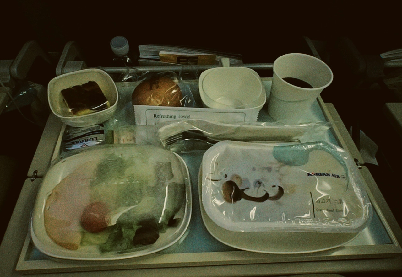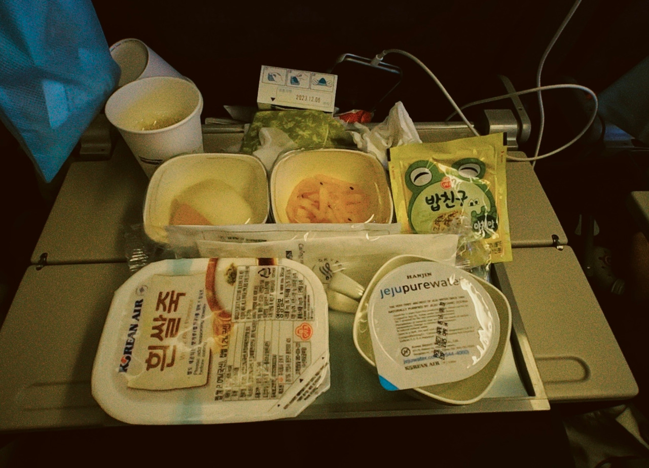 식사 후 1시간 정도 시간이 남아서 면세점 구경을 한 후 뱅기에 탑승했다. 델타항공과 대한항공의 코드셰어를 이용했기 때문에 우리는 대한항공을 탈 수 있었다. 대한항공 특유의 퍼런 뱅기를 기대했지만 캐나다에 갈 때는 SKYTEAM이라고 쓰인 하얀 뱅기를 이용했다. 16시 40분에 출발했기 때문에 이륙을 하고 안정권에 들어가자마자 거의 바로 저녁 기내식이 나왔다. 개인적으로 여행이 설레는 이유 중 하나가 기내식이다. 맛을 굳이 따지자면 엄청 맛있는 것은 아니지만, 뭔가 아기자기하고 쌈박한 바이브가 좋아서 기내식을 좋아하는 것 같다.