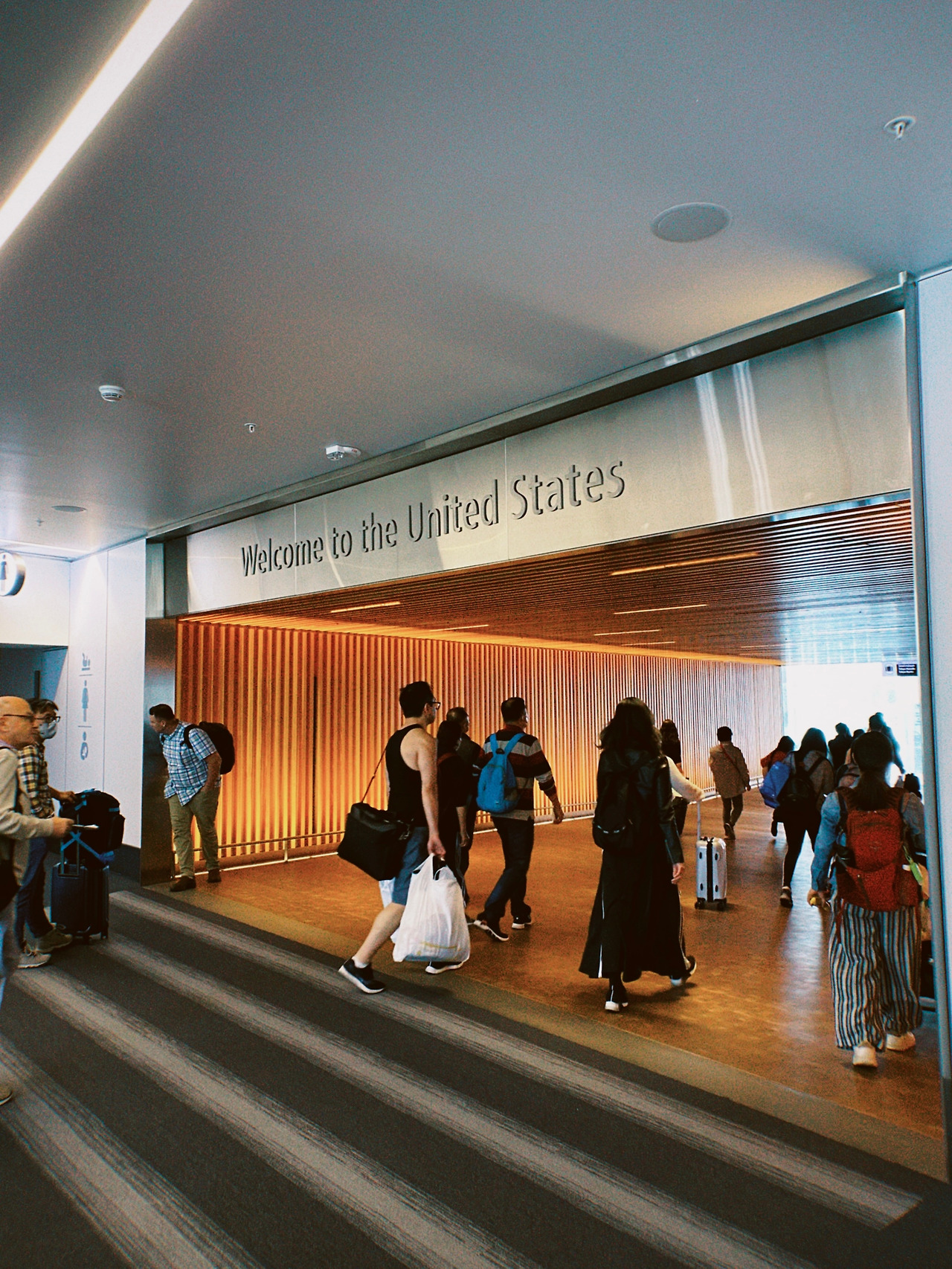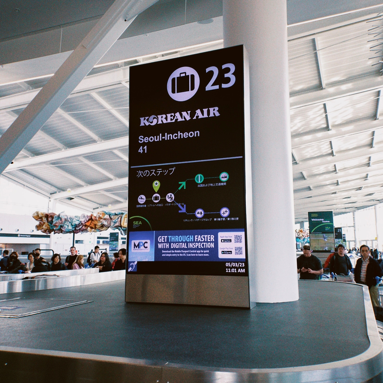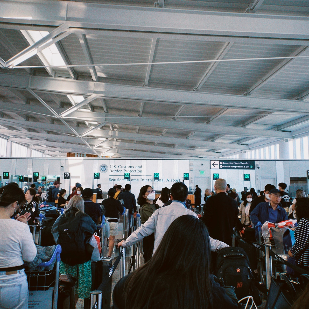시애틀 도착! 비록 경유였지만 내 생애 처음으로 미국 땅을 밟았다. 캐나다 여행을 준비하면서 정말 많은 사람들의 블로그와 경험담을 찾아봤는데 나와 같이 시애틀을 경유하게 되면 지나가게 되는 곳이 있다. 바로 ‘Welcome to the United States’라고 쓰인 곳. 이곳을 지나면 바로 짐을 찾는 곳이 나온다. 한국에서 시애틀을 경유해서 밴쿠버를 들어가게 되면 시애틀에서 위탁했던 수화물들을 다시 다 찾았다가 보내야 한다. 먼저 짐을 찾아서 출입국 심사하는 곳에 가서 심사관을 만나서 “미국에 왜 왔어?” 와 같은 형식적인 질문에 답을 하고 넘어가면 'Transfer'와 ‘Luggage Drop’ 이란 곳이 있다. 그곳을 따라가면 직원들이 우리의 목적지와 짐에 달린 태그들을 확인하고 알아서 짐을 보내준다. 그러고 나서 다시 한 번 소지품 검사를 하면 시애틀의 면세구역에 들어가게 된다. 우리도 일단 부랴부랴 짐을 찾아 인천공항에서 받았던 면세품들을 캐리어에 옮겨 담았다. 미국은 소지품 검사 기준이 조금 빡빡하다는 얘기도 듣고, 실제로 대한항공에 전화해서 향수 같은 액체류들을 구매해서 시애틀을 경유할 때 어떻게 하냐라고 물어봤을 때 시애틀에서 캐리어 찾을 때 옮겨담으시면 된다고 해서 우리는 짐을 찾고 옮겨 담느라 거의 맨 마지막으로 심사를 받았다.