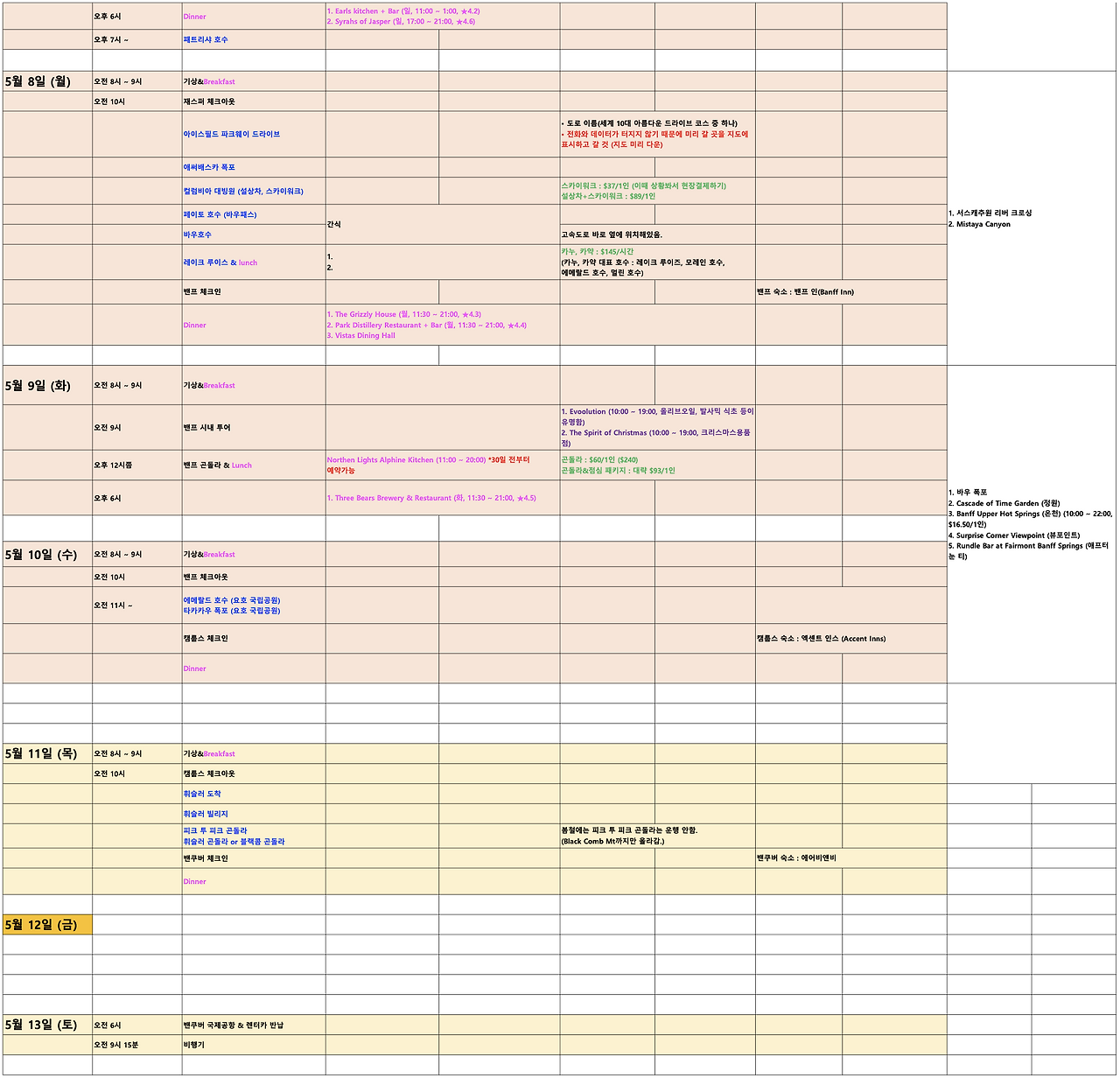 그동안 개인적으로 친구들과 여행을 간 것을 제외하고 온전히 가족들과 자유여행을 떠났던 적을 생각해 보니... 까마득했다. 누나가 캐나다에 있어서 누나를 만날 겸 해서 이번 기회에 캐나다 자유여행을 계획하게 되었다. 사실 말이 자유여행이지, 내가 부모님을 모시고 ‘꽃보다 할배’가 아닌 ‘꽃보다 부모’를 연출해야 했다. 하하하... 처음 계획을 세울 때부터 부모님의 체력과 입맛을 고려해서 데일리 코스와 식당들을 골라야 했다. 젊은 나도 패키지여행처럼 빡세게 다니면 금방 지치기 때문에 상대적으로 여유롭게 계획을 구성하게 되었다. 5월 초에서 5월 중순까지 약 11일간의 자유여행이었고 혹시나 캐나다 여행을 계획 중인 사람들이 있다면 나의 여행이 20%의 팁을 줄만큼의 도움이 되길 바란다!