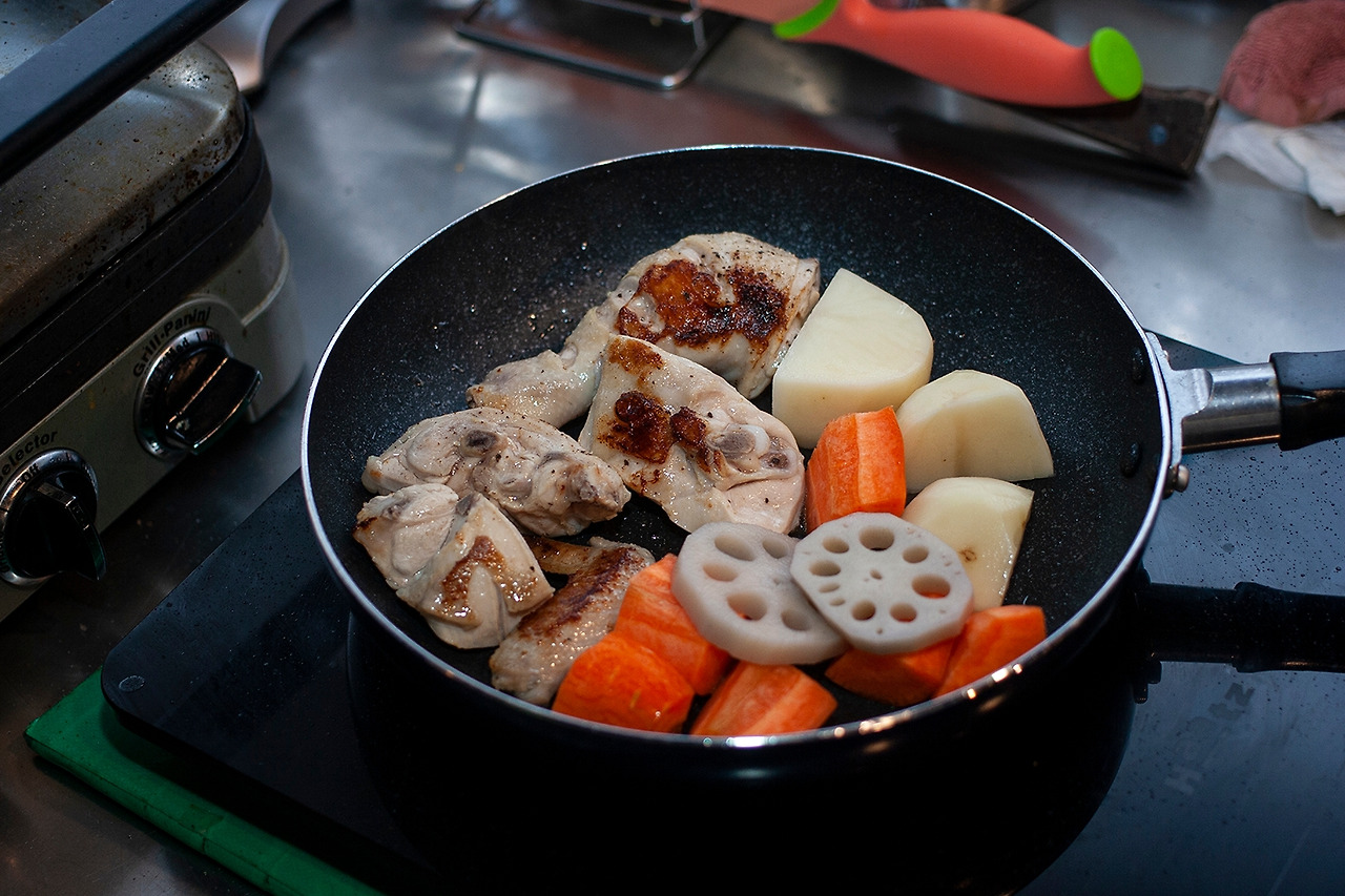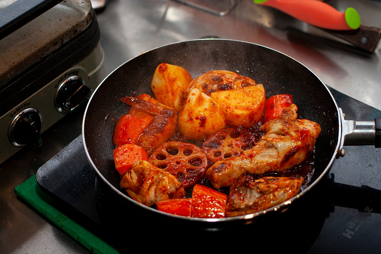 보통 닭도리탕은 웍을 사용하는데, 카페에 인덕션용 웍이 없·······. ㅠ 그래서 하는 수 없이 팬을 사용했다. 기름 무진장 튄다. 웬만하면 깊이가 있는 웍을 사용하는 것을 추천!