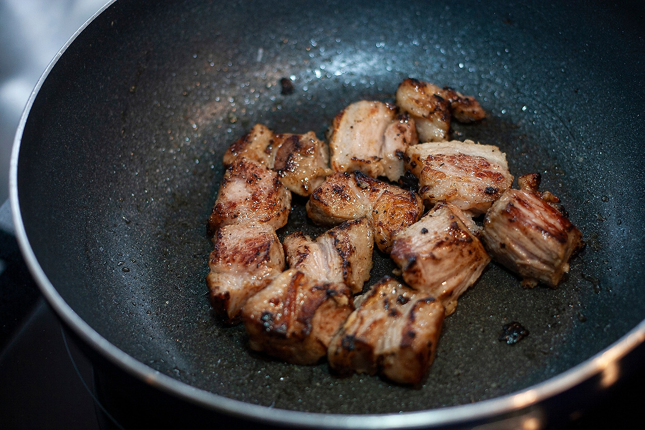 삼겹살의 경우 비계가 많아서 별로 좋은 식감은 아니었고, 돼지 목살이나 앞다리 살을 사용하면 좋다.