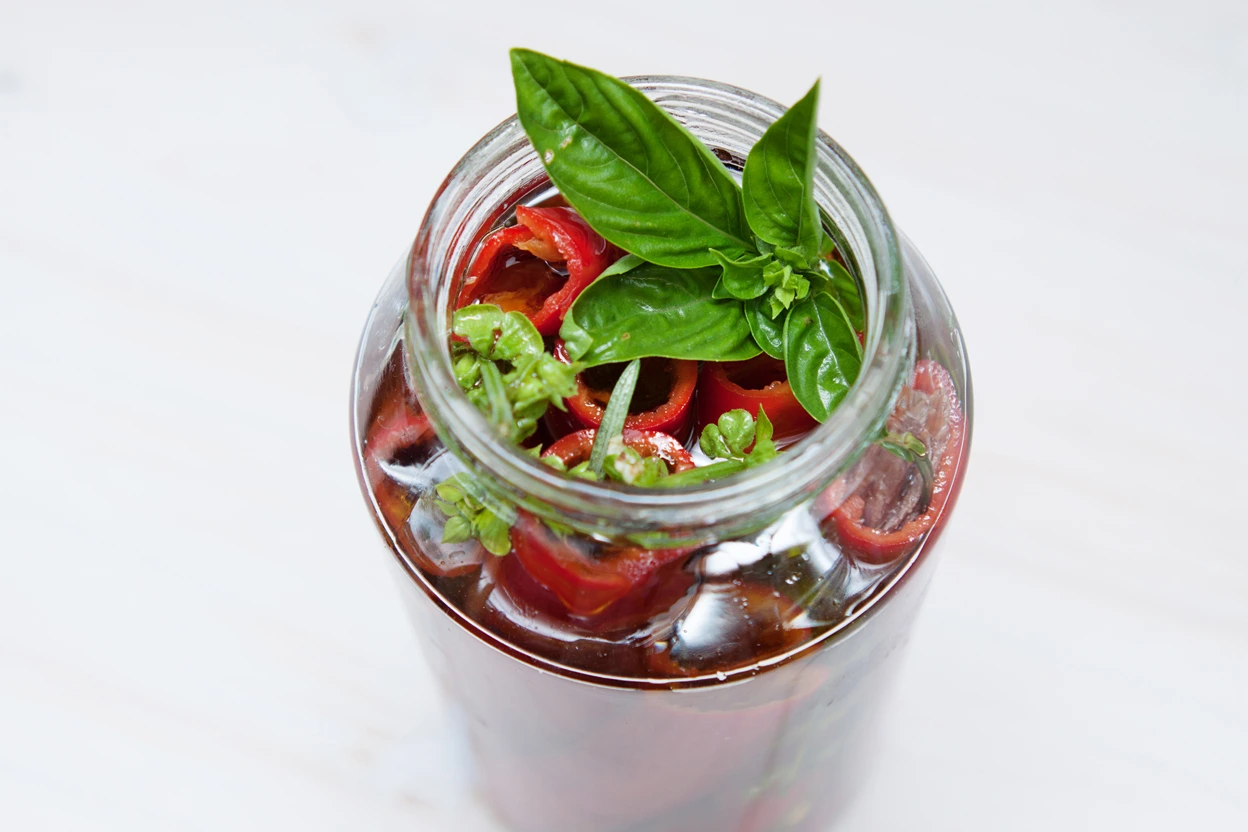 엔초비 1팩, 길쭉한 홍고추 7~8개, 허브(바질, 로즈마리) 약간, 올리브 오일 2~3컵, 꽃소금 약간.