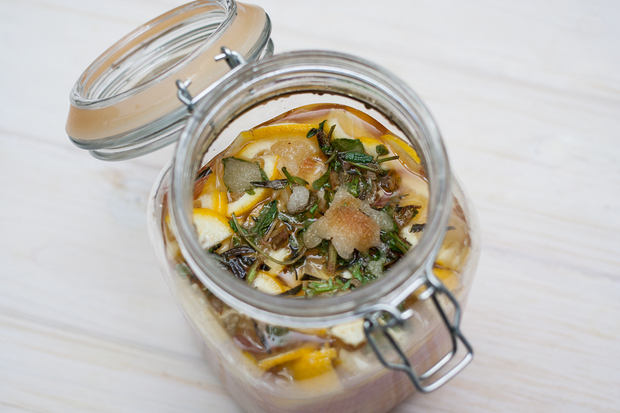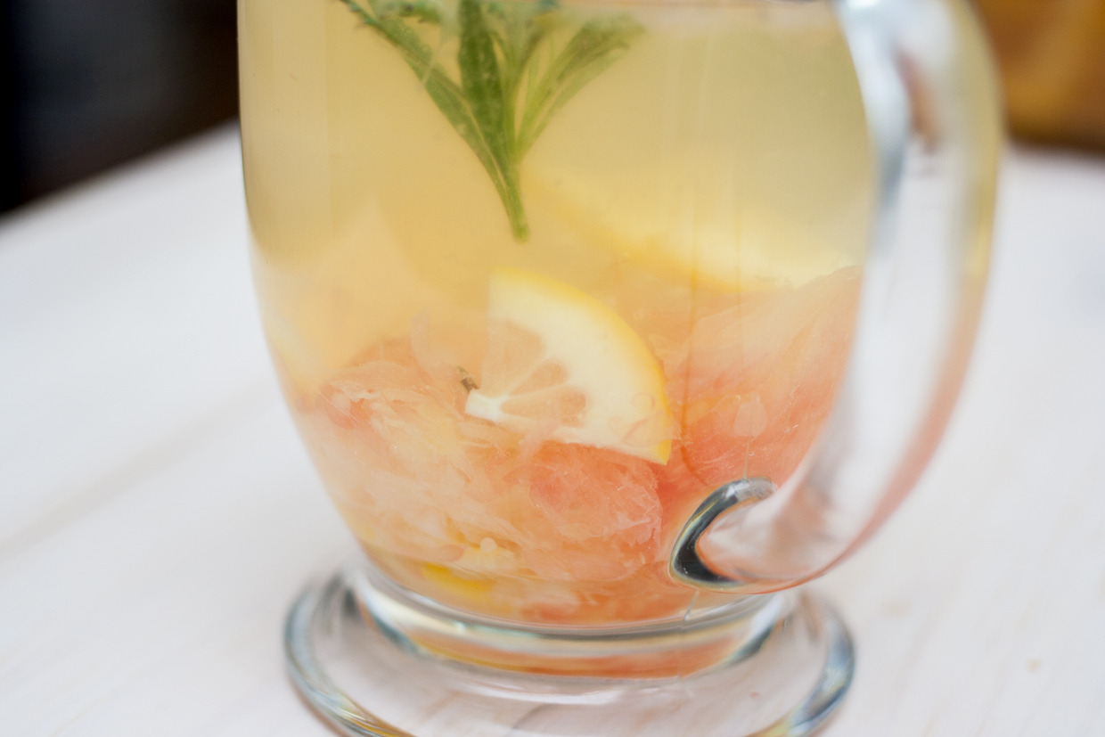 6. 자몽을 다 깠으면 유자설탕버무리를 담은 병에 자몽을 넣고, 그 위에 얇게 썬 레몬을 차곡차곡 올리고, 허브를 종종 썰어서 넣습니다.