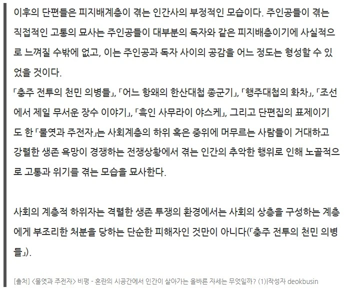 덕부신 님께서도 리뷰에서 대신 말씀해주셨듯이, 이 땅의 피지배계층이 지금도 겪고 있다는 "조국에 배신당한 애국자들의 이야기"를 써볼 생각을 아주 오래 전부터 했고, 그래서 쓴 게 이 <충주 전투의 천민 의병들>이었습니다.