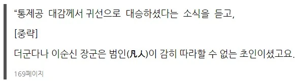 1593년 여름(8월) 이후 마대산 노인에게는 "통제공"(이순신 장군의 가장 높은 존함) 제가 어릴 때는 맥아더 장군을 "맥아더 원수님"이라 불러야 한다며 아이들에게 버럭거리는 어른들도 있었죠이 귀에 익숙했을 것이고, 그 또한 이순신 장군이 초인(신적 존재)이라 믿기에 앞서 부야 스님처럼 "대감"까지 붙일 정도로 기억이 왜곡(이순신 장군을 향한 존경을 부지중에 표현)되는 게 현실적이겠다 싶었던 거지요. 라쇼몽 효과가 마대산 노인의 머릿속에서 일어난 것이죠. 단 한 번 일어난 걸 보면 확실하지요.