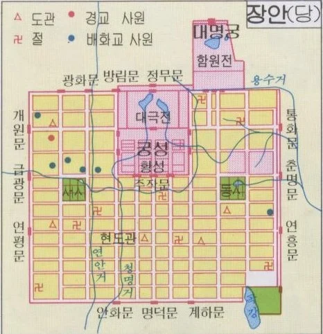 당나라 수도 장안(시안)의 구조. 노란 네모들이 '방'이다