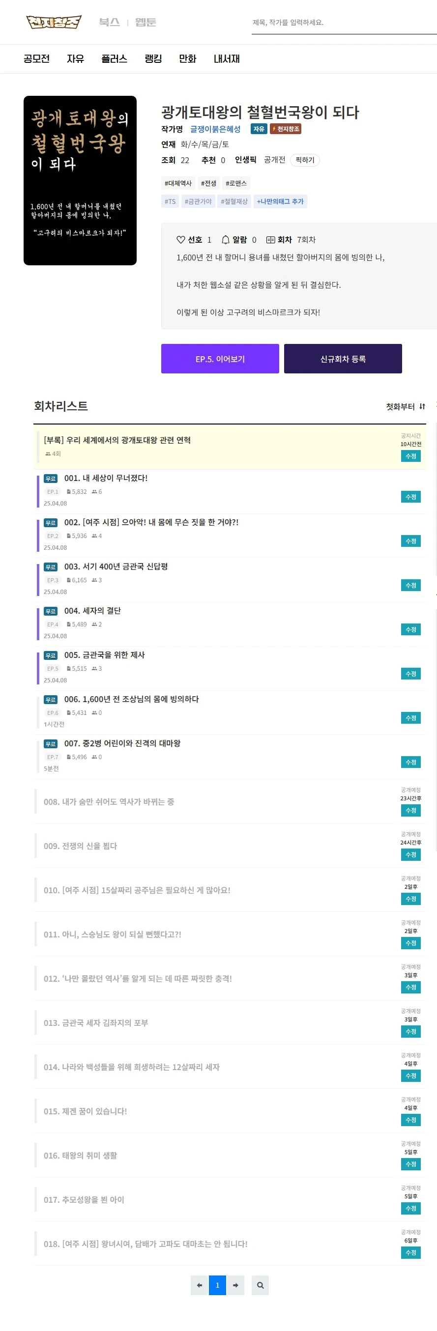 현재 019화까지 예약 발행을 했고, 020화를 쓰고 있습니다.