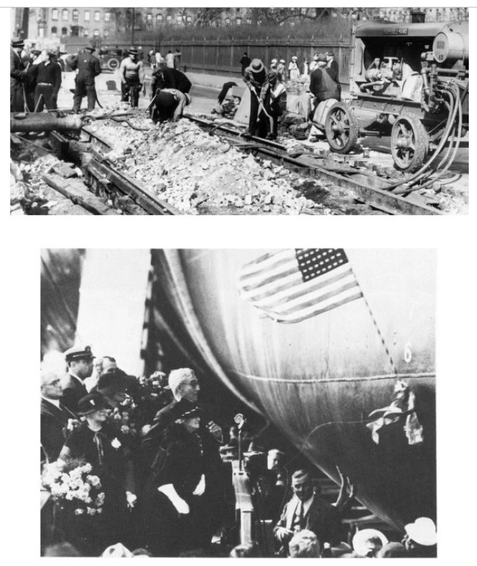 뉴딜 정책 추진 때의 공공 공사현장(상)과 뉴딜 정책의 일환으로 진수되는 엔터프라이즈 항공모함