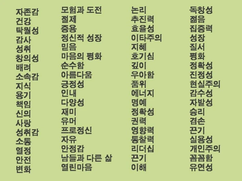 아래의 <가치 리스트>에서 본인이 가장 중시하는 5가지를 뽑고 다른 이웃을 지목하여 계속 진행하는 방식이다.