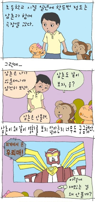 그 시절엔 정말이지 이렇게 재밌는 걸 왜 같이 안 볼까 하는 궁금증이 있었다. 조금 시간이 흐르고서는 삼촌이 우뢰매를 함께 보지 않았던 이유는 아이와 어른의 취향이 다르기 때문이라고 생각했다. 그런데 미국의 경우를 보니, 어른도 만화영화와 만화책을 즐겨보는 게 아닌가? 물론 예전 국내 만화영화와 만화책을 수준이 다른 나라의 것들에 못 미쳤을 테지만 단순히 그 이유가 전부는 아니라고 본다.