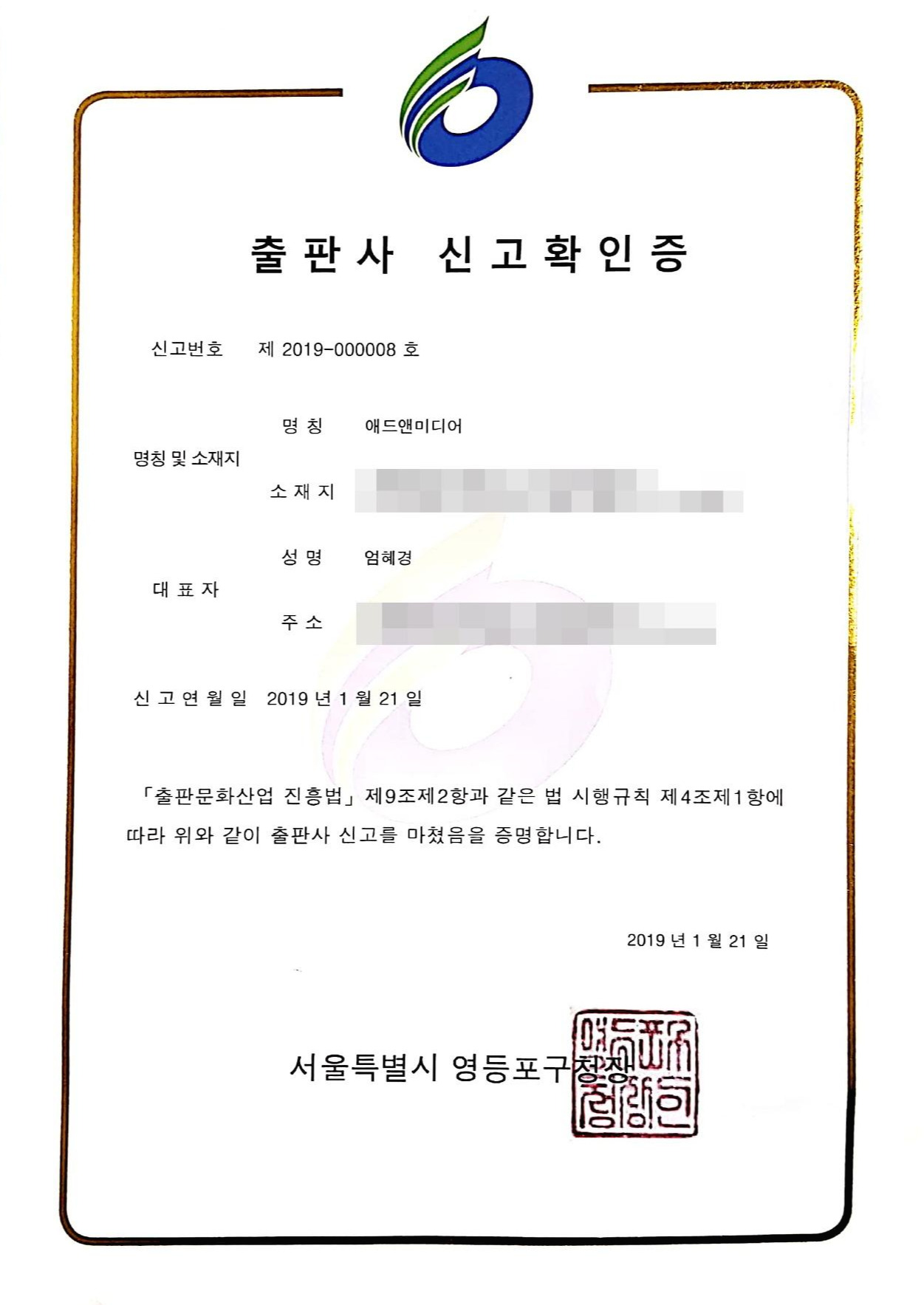구청의 문화체육과 방문 -> 출판사 신고증 작성 -> 준비서류 제출 -> 2~3 후 수령 문자 오면 -> 신분증 가지고 수령 -> 기한 내 면허세 납부(27000원 인터넷 납부 가능)