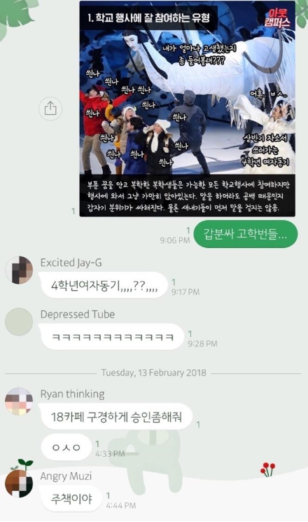 특히 군대에 갔다가 돌아온 복학생들은 ‘새내기를 꼬시러 간다’는 누명이 자연스럽게 따라오기 때문에 새내기가 있는 자리에 쉽게 가지 못한다. (그런 경험적 사례가 누적됐기 때문에 복학생들의 이미지가 박혀있을지도 모르지만, 그건 일반적인 모습이 아니라는 것을 강조하고 싶다…) 물론 정말로 꼰대나 아재가 된 사람들도 있지만, 내 주변 사람 중에는 오히려 그동안의 철없음이 사라지고, 더욱 성숙한 어른이 된 선배들이 대부분이었다.