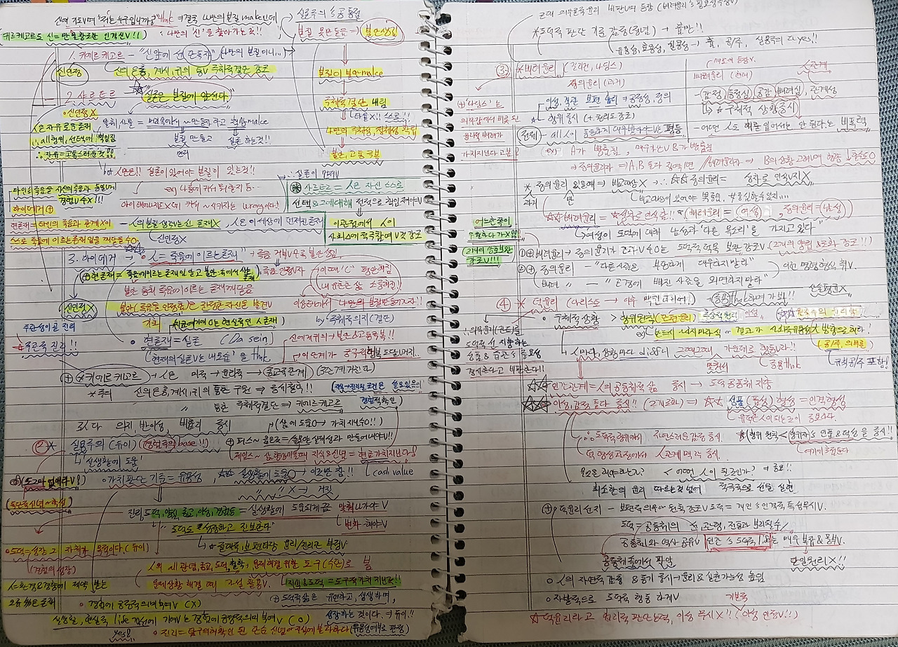 국어는 문학, 비문학, 화·작·문 모두 문제 선지의 근거가 본문 어디에 있는지, 선지 내용과 관련 있는 본문 내용을 찾는 방식으로 기출 분석을 하면 된다. 앞서 말했지만, 기출 분석은 그 문제의 해설을 직접 만드는 작업이라 할 수 있다. 수능 기출문제집의 해설을 보면 선지가 맞는지 틀리는지 근거가 본문 어디에 있는지 표시해두고 있다. 기출 분석을 어떻게 하는지 잘 모르겠다면 본인이 풀고 있는 문제집의 해설을 참고하기를 바란다. 그리고 문법은 겨울방학(12월~2월) 동안 인터넷 강의 등을 통해 문법 내용을 한 번 훑으면서 정리 공책을 만들어두면 편하다. 문학 분야는 수능특강, 수능완성에 나온 내용을 기억하기보다, 작품의 전반적 줄거리, 특징을 알아두는 것이 더 효과적이다. 수능특강은 해설집을 보면 작품 전체 줄거리, 시대 배경, 주제, 작가에 대한 정보 등이 정리되어 있으니 참고하길 바란다.