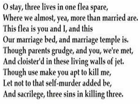 이 시는 남성 화자가 연인에게 육체적인 관계를 맺을 것을 설득하는 에로틱한 내용을 담고 있습니다. 남자는 “벼룩이 내 피 뿐만 아니라 당신의 피도 빨았기 때문에 우리는 이제 하나이다. 그러므로 우리 둘이 피를 섞는 행위는 그리 큰 일이 아니다”라고 말함으로써 정조를 지키려는 연인을 유혹하고 있는 것입니다. 벼룩과 사랑이라는, 전혀 어울리지 않는 이미지의 결합 속에서 숨어있는 유사점을 발견한 것이 재치 있으면서도 신기하지 않나요?