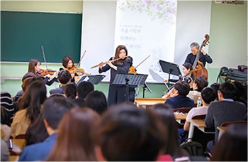 강의실 콘서트는 주로 서울시향 단원 7명이 강의실에 직접 방문하여 경희대학교 학생들만을 위해 연주하는 공연입니다. 18년도 1학기에 열린 강의실 콘서트에서는 바이올리니스트, 비올리스트, 첼리스트, 더블베이스트, 플루이스트 단원이 왔으며, 조은아 교수님 말씀에 따르면 매 학기마다 강의실 콘서트에 오시는 악기 연주자가 다르다고 합니다. 악기 본연의 울림을 생생하게 느끼고, 연주를 하는 동안 단원들이 주고받는 호흡과 몸짓을 아주 가까운 거리에서 체험할 수 있는 것은 결코 흔치 않은 경험이라고 생각합니다. 강의실 콘서트는 학점 관리와 스펙 쌓기로 인해 몸과 마음 모두 지친 학생들에게 잃어버렸던 감수성을 되찾게 만들어 주는 서울시향의 ‘선물’입니다.