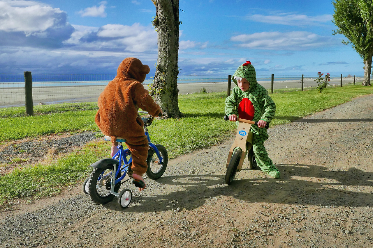 홀리데이 파크에는 정해진 구역이 있어서 선을 밟으면 죽지는 않지만, 남의 집을 밟고 있는 실례를 저지르게 된다. 우리 옆 집에는 곰과 공룡의 탈을 뒤집어쓴 꼬마들의 자전거 연습이 한창이었다. 사진을 찍어서 보여 주었더니 사진 속 본인에게 이름을 부르며 인사를 건넨다. 귀를 기울여 옹아리 영어에 집중해야 하는 나와 달리 꼬마들은 내 말을 쉬이 듣고 서너 배가 넘는 문장을 돌려준다. 애초에 내 말은 별 관심이 없고 본인이 하고 싶은 말을 뱉는다는 것이다. 그래도 잔뜩 인상을 구긴 곰 형의 사진은 특별히 치즈를 외친 것이라는 설명을 얻어냈다. 너무나 귀여워서 귀가 녹아 버릴 것 같다. 나는 영어 공부한 보람을 이런 곳에서 찾고 있다.