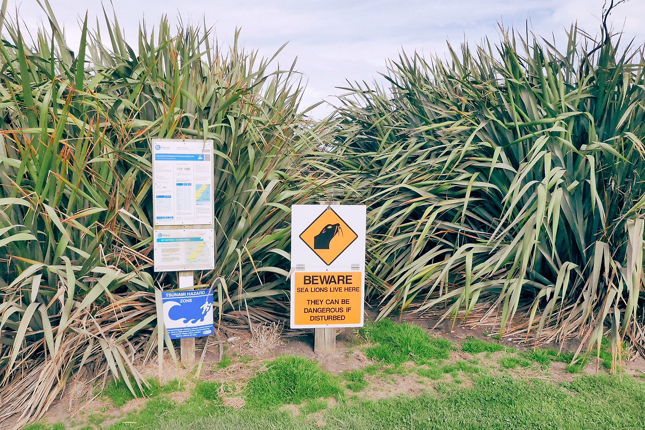 남섬 여행지를 추천해달라는 내 짧은 영어 질문에 본격 키위 마이클은 그곳으로 가면 돌고래와 서핑을 할 수 있다며 말랑한 내 가슴에 돌을 던졌다. 덕분에 남섬 여행을 출발한 지 한 시간만에 비로소 최종 목적지가 정해졌다. 우리는 뉴질랜드 남섬 최남단인 슬로프 포인트(Slope Point) 옆에 있는 큐리오 베이(Curio Bay)까지 가야만 했다. 그리고 일주일 후, 인적없는 들판을 지나 휴대폰이 터지지 않는 황량한 곳, 우리는 마침내 돌고래 놀이터에 도착했다. 두근대는 마음을 안고 캠프 사이트로 향하는 길에 마주한 경고문에 가슴이 철렁한다. 세상에 바다사자를 조심하라니, 어떡해, 여기 바다사자도 있나 봐. 오, 나 여기 너무 좋아. 나 되게 조심할래. 라고 생각했다.
