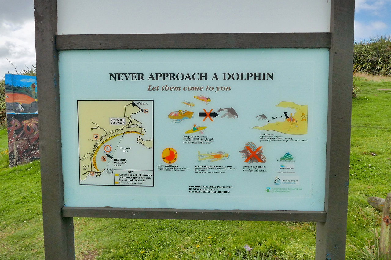 다음 날 아침, 바닷가 근처 주차장에 차를 옮겨 두고 산책을 하는 중에 발견한 안내문이 나는 무척 마음에 들었다. 바다사자를 만나지 못해 잔뜩 쌓인 불신을 닦아내는 안내문이었다. 내 마음대로 해석하자면 이렇다. ‘절대로 돌고래에게 다가가지 마세요. 그들이 당신에게 다가오도록 두세요. 거리를 두지 않고 다가가면 그들은 놀라서 도망갈 거예요. 돌고래를 유혹하는 가장 좋은 방법은 그냥 물에 떠 있는 거예요. 대신 먹이를 주거나 만져서는 안 돼요. 뉴질랜드에서 돌고래를 방해하는 것은 불법이에요.’ ‘disturb’의 여러 가지 뜻 중에서 아마도 ‘(환경)을 교란시키다. 파괴하다’ 쯤이 알맞은 한국어겠지만 나는 내 번역이 마음에 들었다. 저렇게 귀엽게 노는 돌고래를 방해하는 것은 불법이어야 한다. 마침 얼마 전 울산의 고래생태체험관에서 일주일도 견디지 못하고 폐사한 돌고래의 소식이 떠올랐다. 친절한 뉴질랜드 안내문을 울산 시청에 공문으로 보내고 싶은 심정이었다.