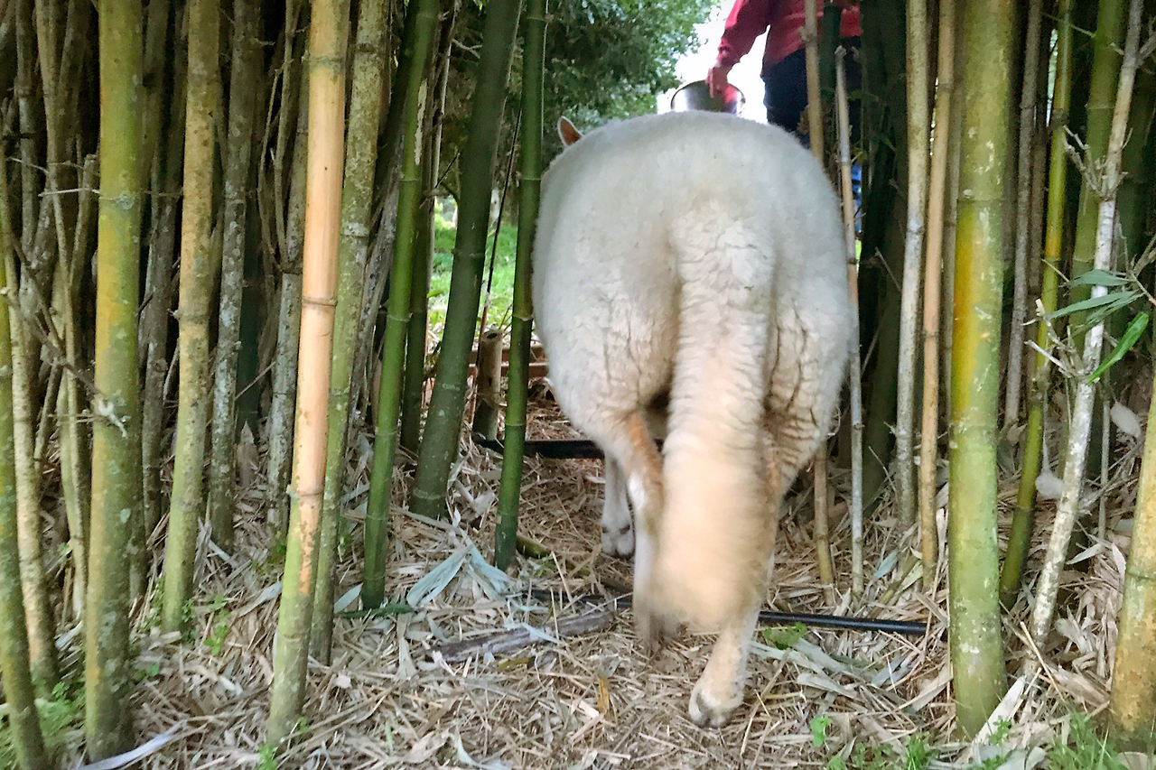 이제 대나무를 처리할 시간이다. 우리는 보호 안경과 귀마개를 장착하고 요란한 소리를 내며 대나무를 씹어 먹는 기계 앞으로 향했다. 나는 건네받은 안경의 다리가 귀에 걸어지지 않아서 애를 먹었다. (뭐야, 다들 왜 이렇게 머리가 작아.) 간단한 설명을 듣고 나서 대나무 잎을 좋아하는 양에게 물어 뜯겨 아래 줄기가 허전한 대나무 더미들을 기계에 연신 집어넣었다. 기다랗고 단단한 대나무를 기계가 무식하게 삼킬 때면 예상하지 못한 방향으로 대나무를 튕기는 경우가 있는데, 탄력 있게 튕겨 난 굵은 대나무 한 줄기가 내 얼굴을 세차게 내리치기도 했다. 오후 한 시, 모든 일을 끝내고 샤워실 거울을 마주한 내 몰골은 진흙과 나뭇조각이 온몸에 덕지덕지 붙은 것이 제법 초보 일꾼 티가 났다.