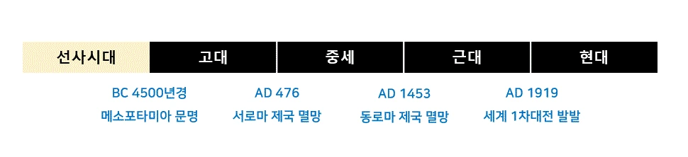 선사시대도 여러 시대로 구분된다. 하지만, 이 시기까지 세계사로 다룬다면 얘기가 너무 길어진다. 간단하게 정리하면, 선사시대는 인류가 사용한 도구에 따라 구분된다. 학창 시절에 배운 구석기시대, 신석기시대, 청동기 시대, 철기 시대가 이에 해당된다.