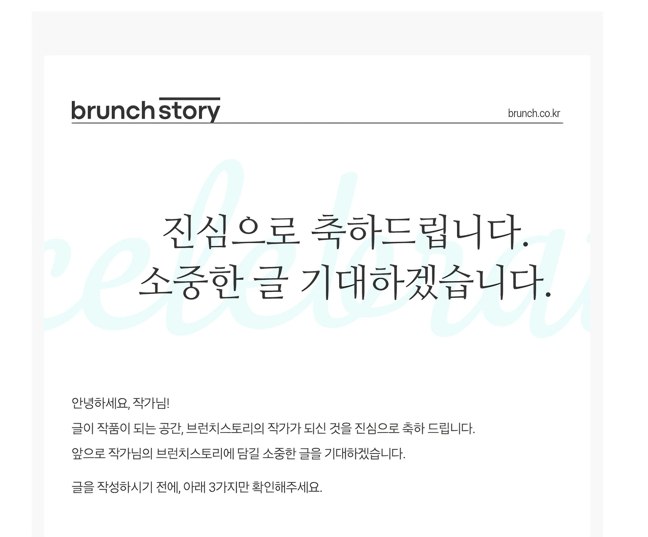 그러던 중, 친한 지인의 소개로 “슬초브런치 3기” 수업을 듣게 되었고, 이은경 작가님께 배운 대로 글을 브런치에 발행해 보았다 그리고 얼마 후, 브런치에서 합격 메일을 받았다