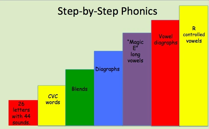 또한 알파벳의 글자 수는 파닉스에서 가르치는 소리의 수와 다르다. 파닉스에는 44 개의 소리가 있다. 어떤 경우에는 두 글자가 하나의 소리를 낼 수 있기 때문이다 (예 : th, sh 등). 이를 Digraphs (2 글자 1 음)라고 한다. 따라서 단순화하려면 간단한 문자 소리 (1 문자 및 1 소리)로 시작한다. 각 문자에 대해 문자 이름, 소리, 모양, 이 문자로 만드는 문자 형성을 소개한다. 글자에서 단어 문장으로 확장한다.