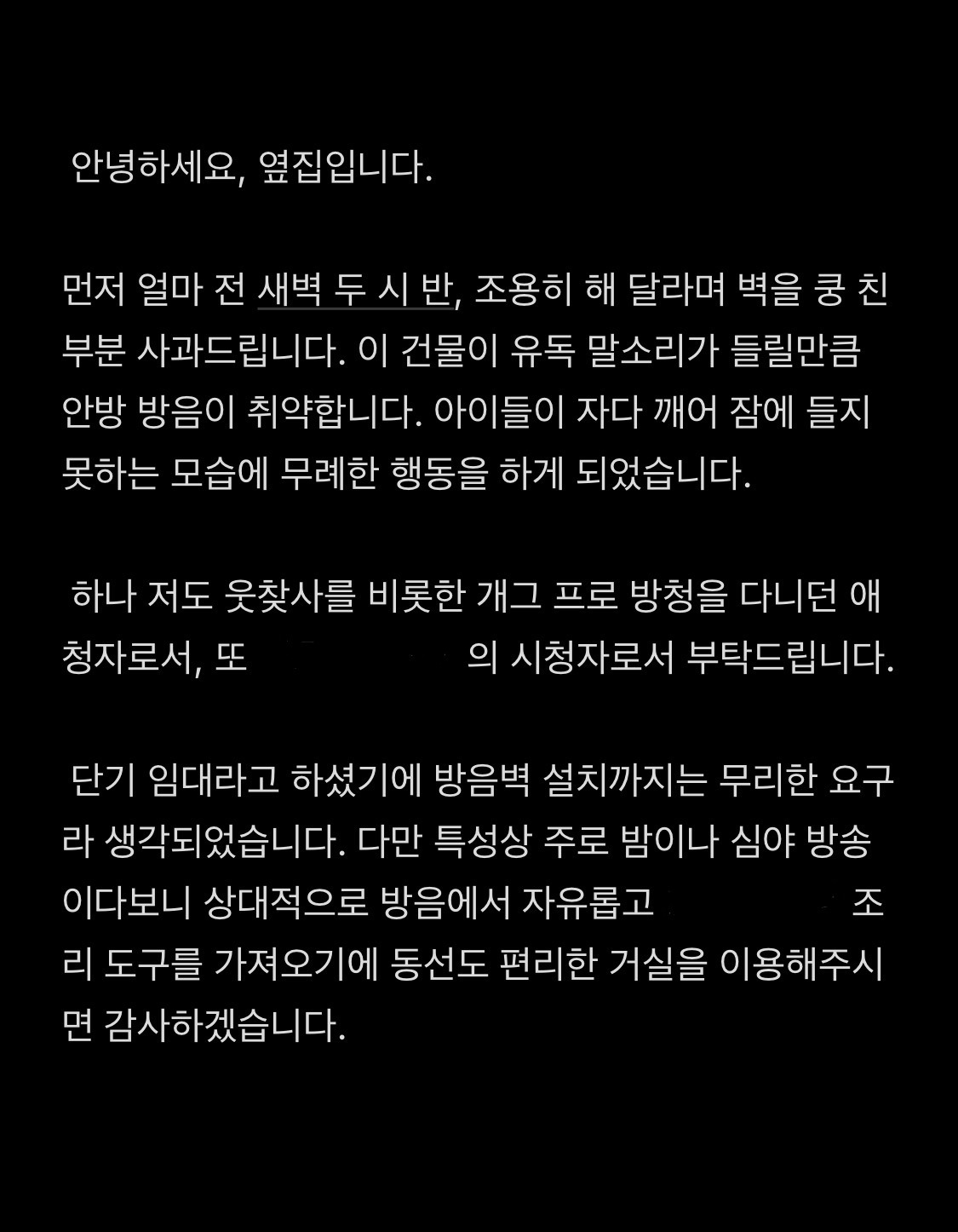 “아, 방음 옆집도 밤에 쿵쿵거리는 것 보면 안 괜찮은 것 같은데 아직은 문제 없어요. 시끄럽다고 하면 뭐 당연히 바로 사과하죠. 흐흐흐”