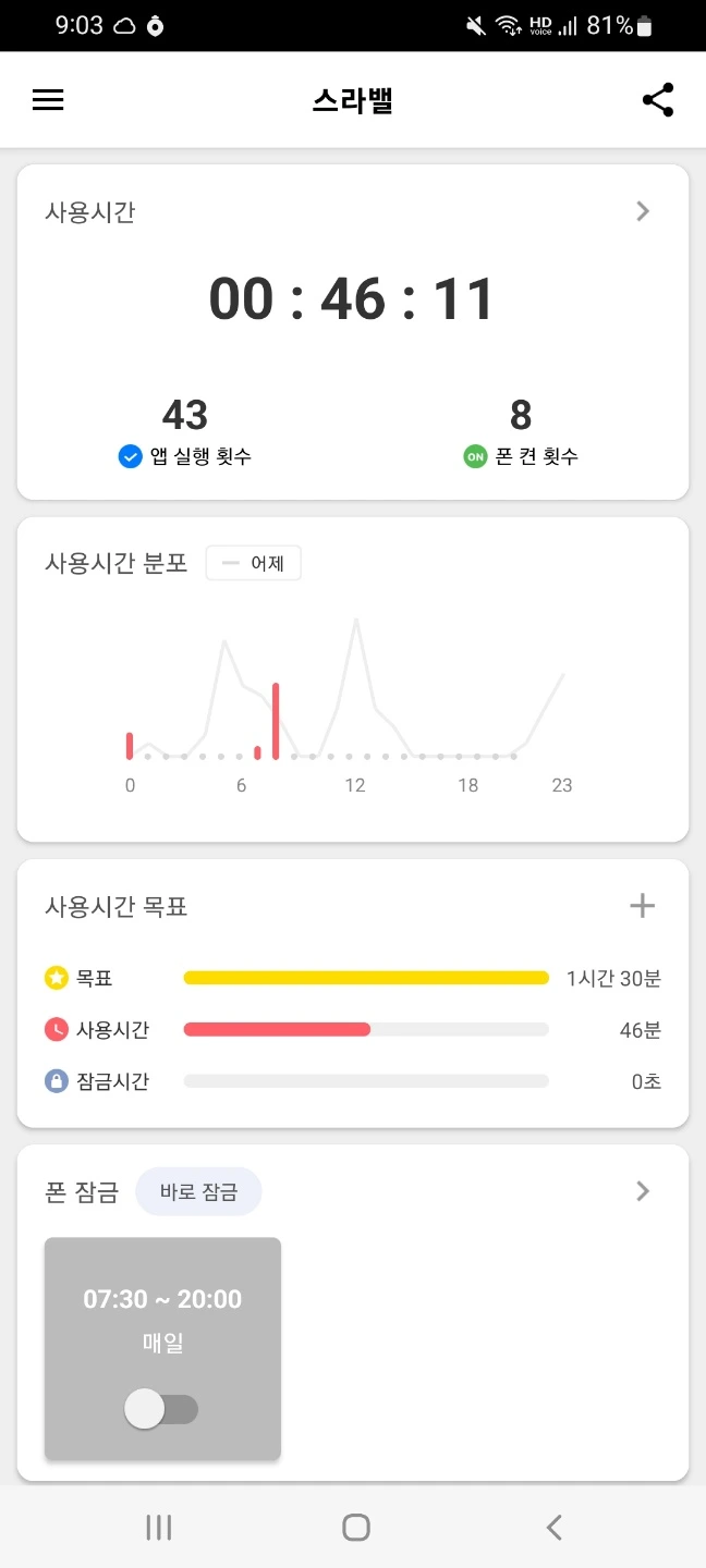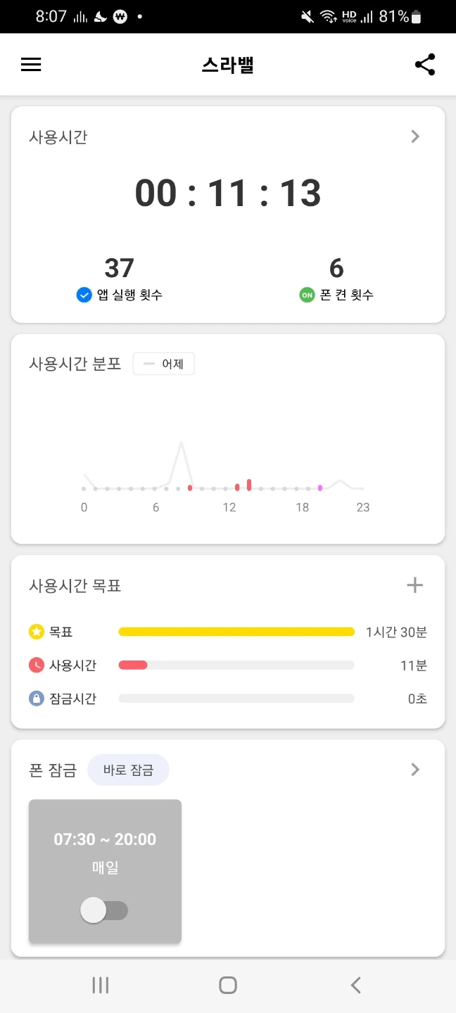 확 줄어든 시간이 보이시죠? 11분이라니!! 의지+환경의 합작품, 정말 멋집니다! 사용시간뿐만 아니라 앱실행 횟수, 폰 켠 횟수 또한 확연히 줄어들었습니다. 이분은 이후로도 하루 한 시간 정도만 스마트폰을 사용하고 계십니다.