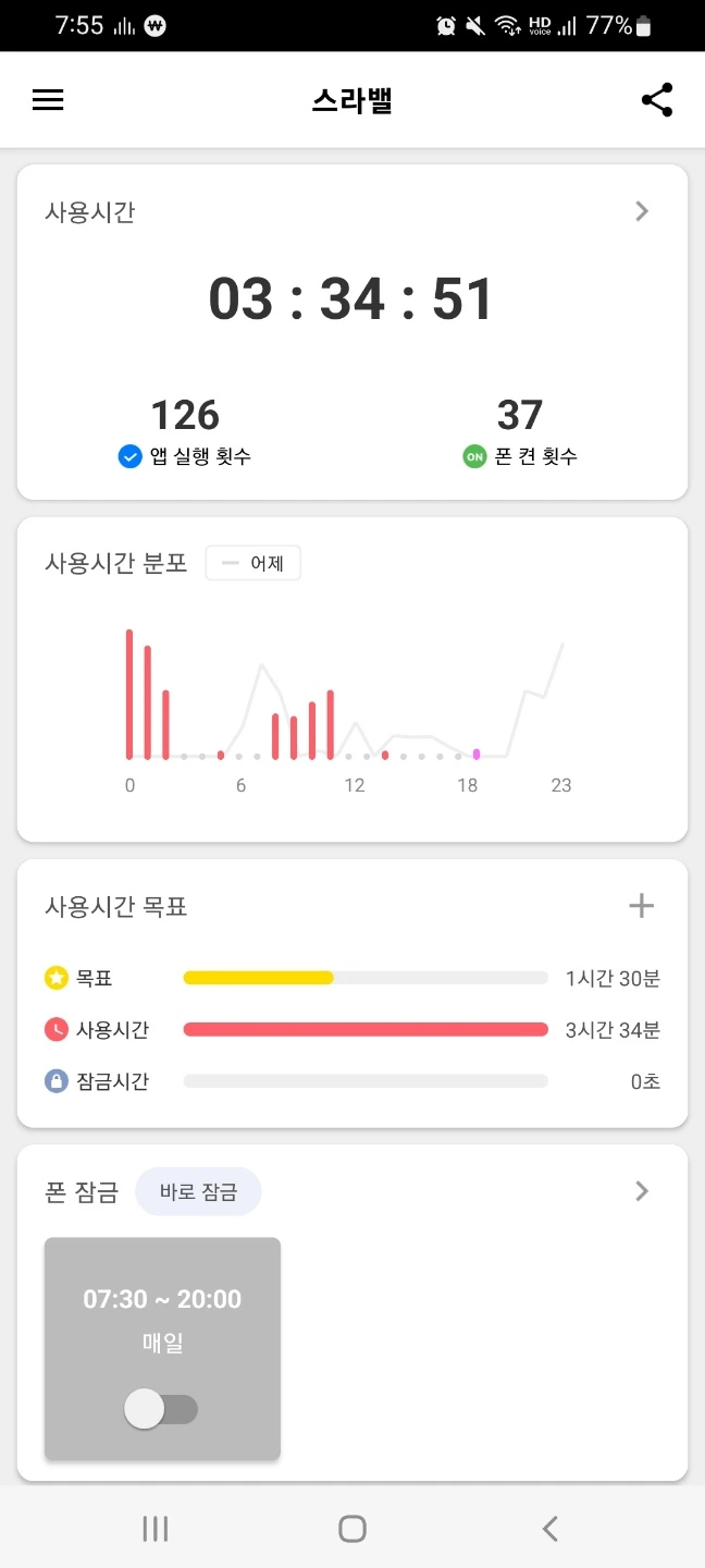 저의 추천으로 많은 분들이 몰입의 방에 스마트폰을 넣기 시작하셨어요. 그중 아주 큰 효과를 보신 분이 계셔서 소개해드리고자 합니다. 일단 첫 번째 기록은 스마트폰 감옥인 '몰입의 방'을 사용하기 전인데요, 사용시간과 앱실행 횟수, 폰 켠횟수(폰 잠금 해재)등을 확인해 주세요.