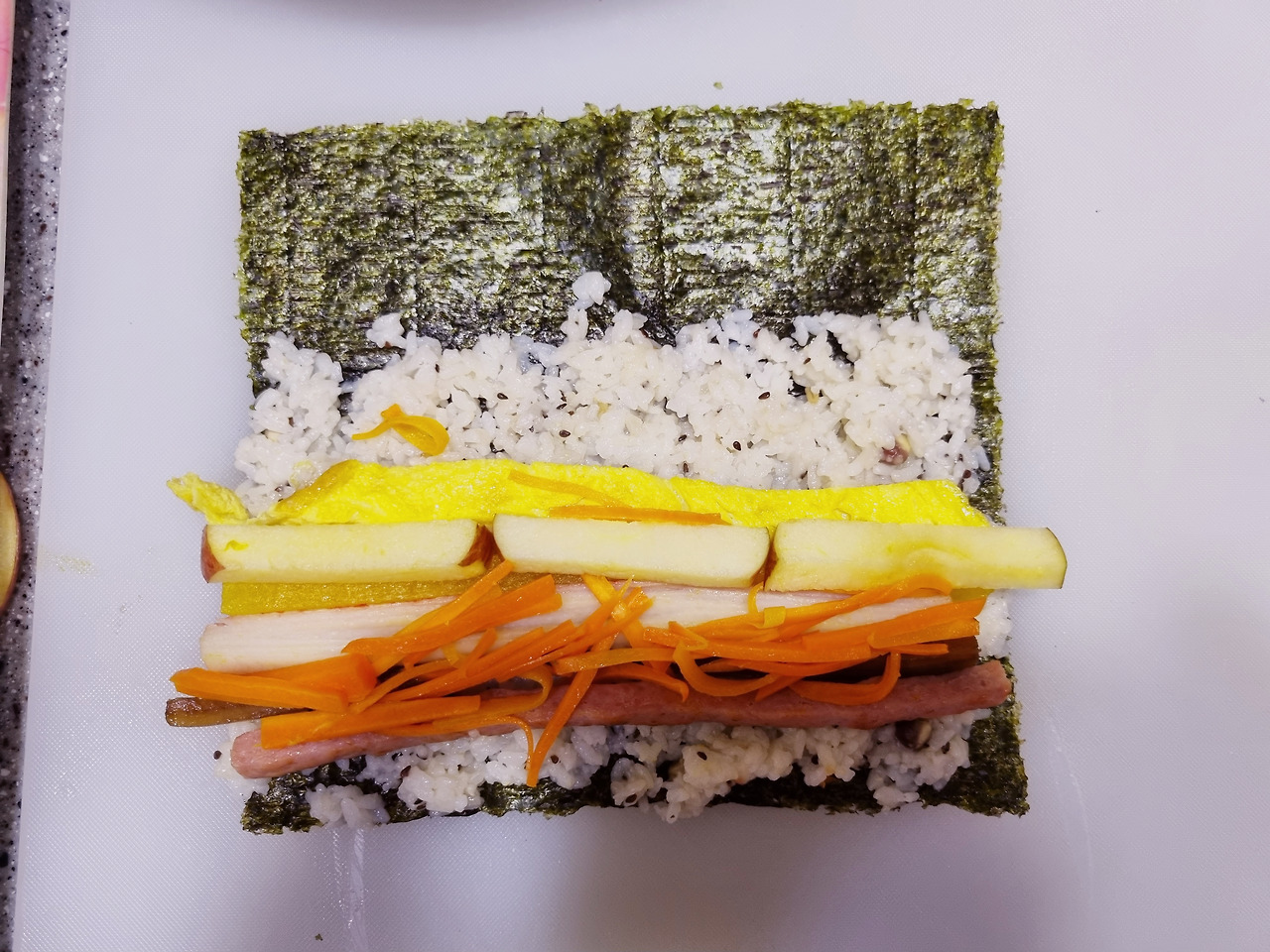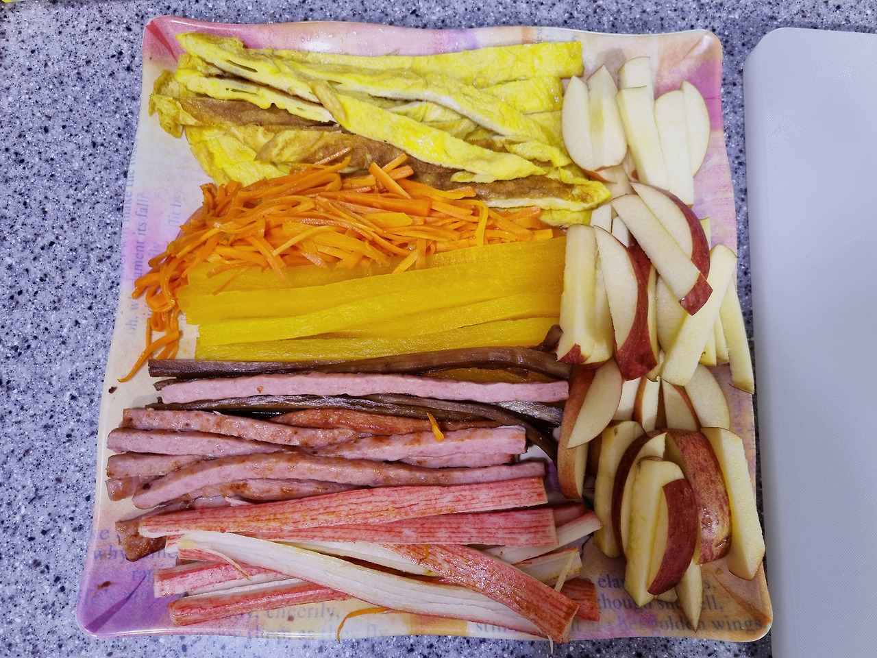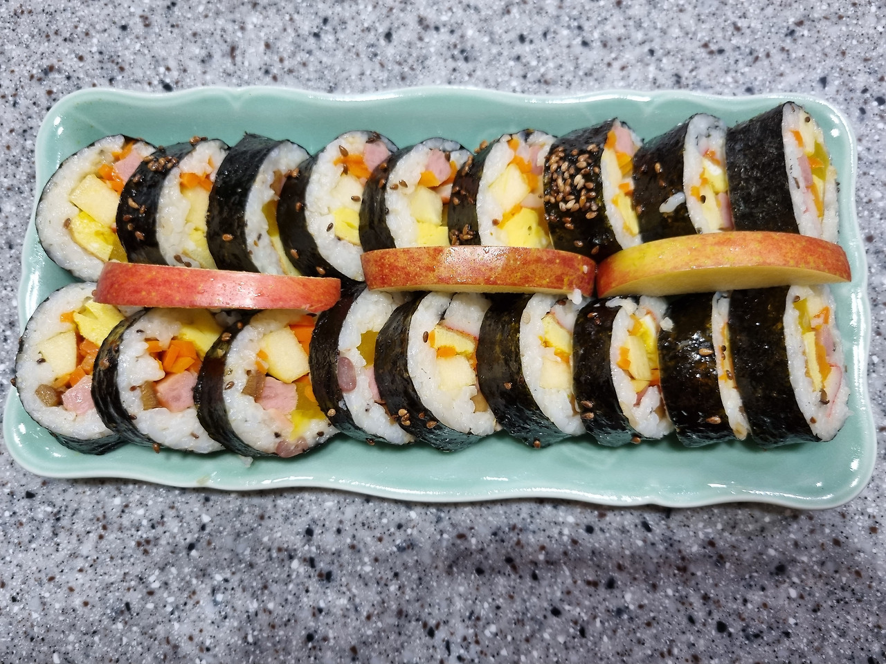제가 초등학생이었던 20여 년 전부터 엄마는 김밥에 사과를 넣어주셨습니다. 새콤달콤하고 아삭한 식감이 김밥을 먹는 즐거움을 더해주었지요. 참치김밥, 김치김밥, 멸치김밥등 엄마가 싸주신 김밥은 다 맛있지만, 그중에서 으뜸은 당연히 '사과김밥'입니다.