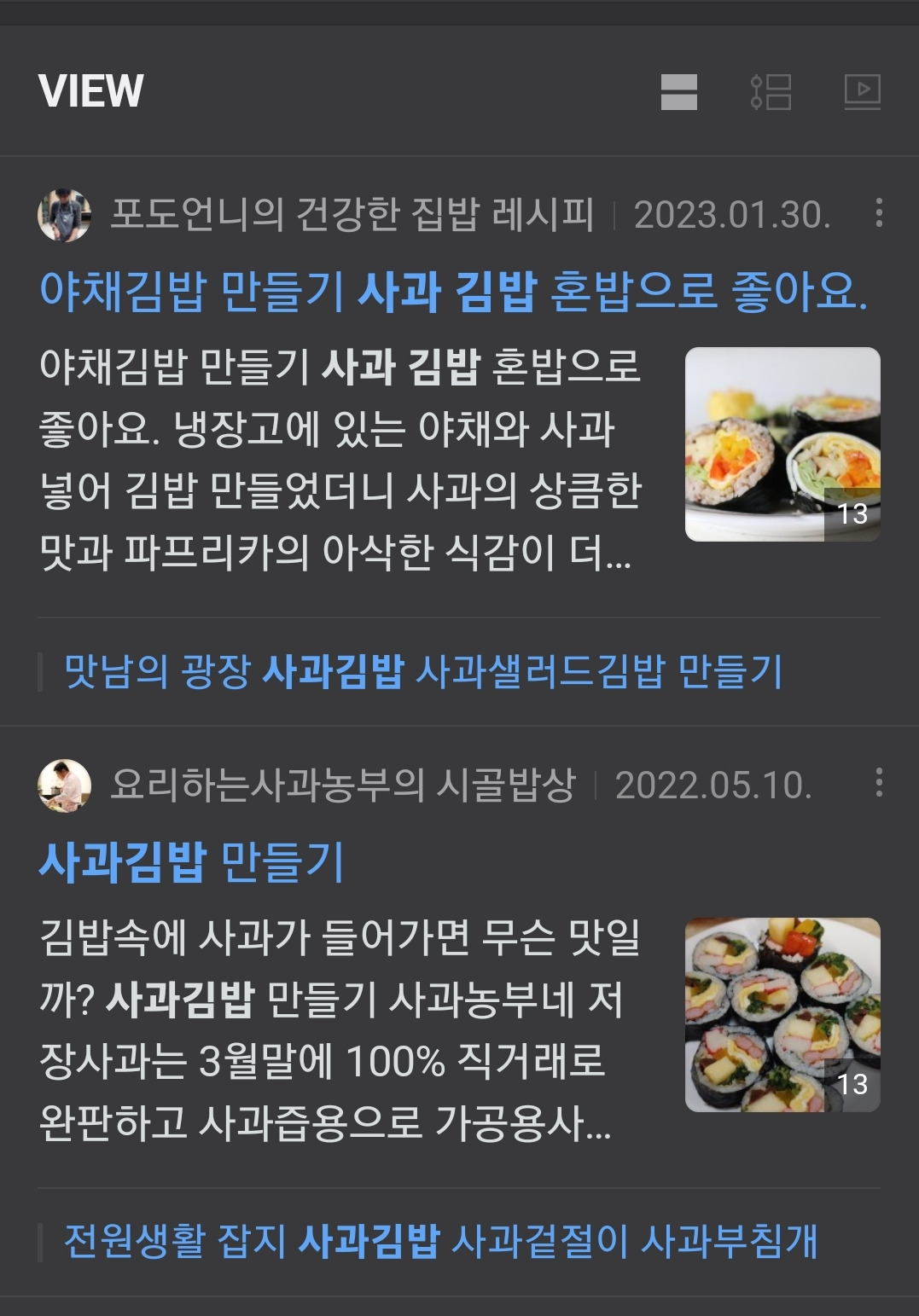 인터넷에서 사과 김밥을 만나니 반가웠습니다. 검색결과가 많지는 않았지만 사과김밥을 먹어본 사람들이 있다는 사실이 말이에요.
