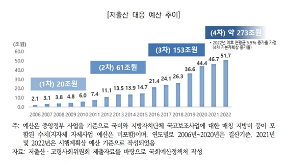 참고로 저출산대응 예산추이를 보면 현재가 4차계획 추진중임에 따라 현재까지 소요된 예산이 총 약 300조원정도가 됩니다. 그래서 언론 등에서 "300조를 쏟아붓고도 합계출산율 0.78" 이런 기사가 나오는 겁니다.