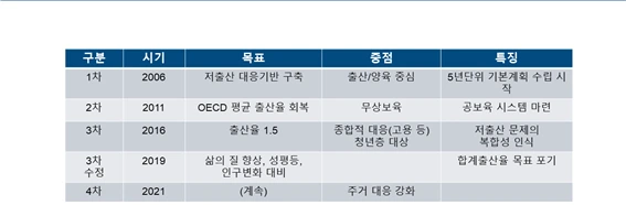 그럼 각 차수별로 저출산(고령화는 제외할게요.. 고령화대응은 주로 기초연금 등 상대적으로 간단합니다) 기본계획의 내용 및 성과 등을 아주 간단히 설명해보겠습니다.
