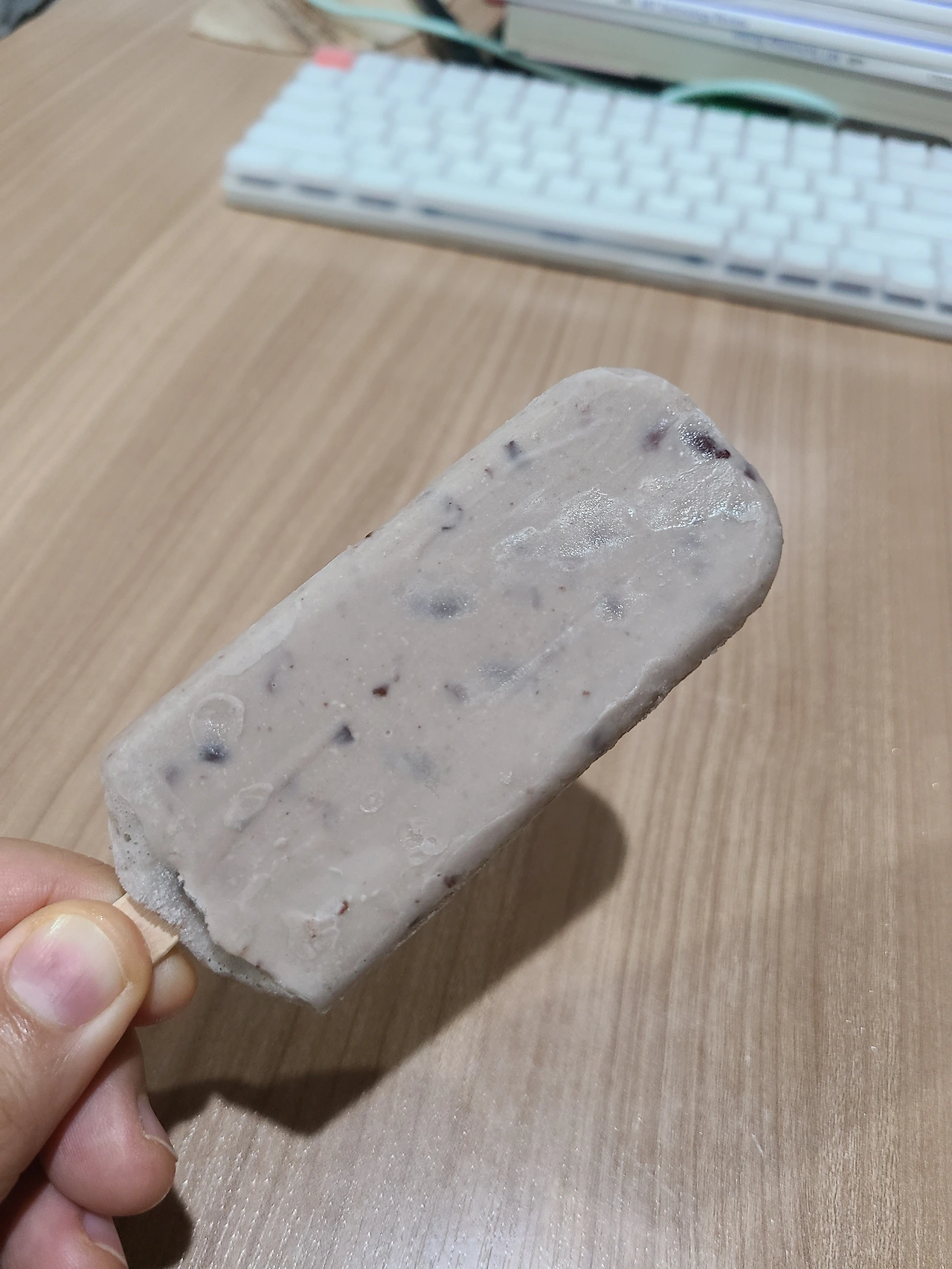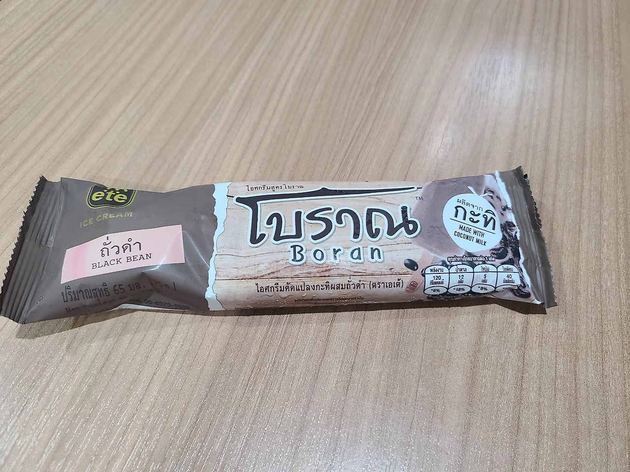 아이스크림은 최대한 자제하지만 이 제품을 보면 참을 수 없다. 검은콩이 들어간 것 같은데 맛은 영락없는 비비빅이다. 비비빅보다 조금 덜 단 맛이라고 해야 하나. 포장지를 보니 ผลิตจาก กะทิ라는 글자가 보이고 태국어를 조금 읽을 줄 알아서 이게 '파맅짴 까티'라고 발음된다는 것을 알았다. 찾아보니 '코코넛 밀크로 만들어진'이라는 뜻이다. 뜻은 정확히 몰랐지만 발음은 맞아서 꽤나 기쁘다.