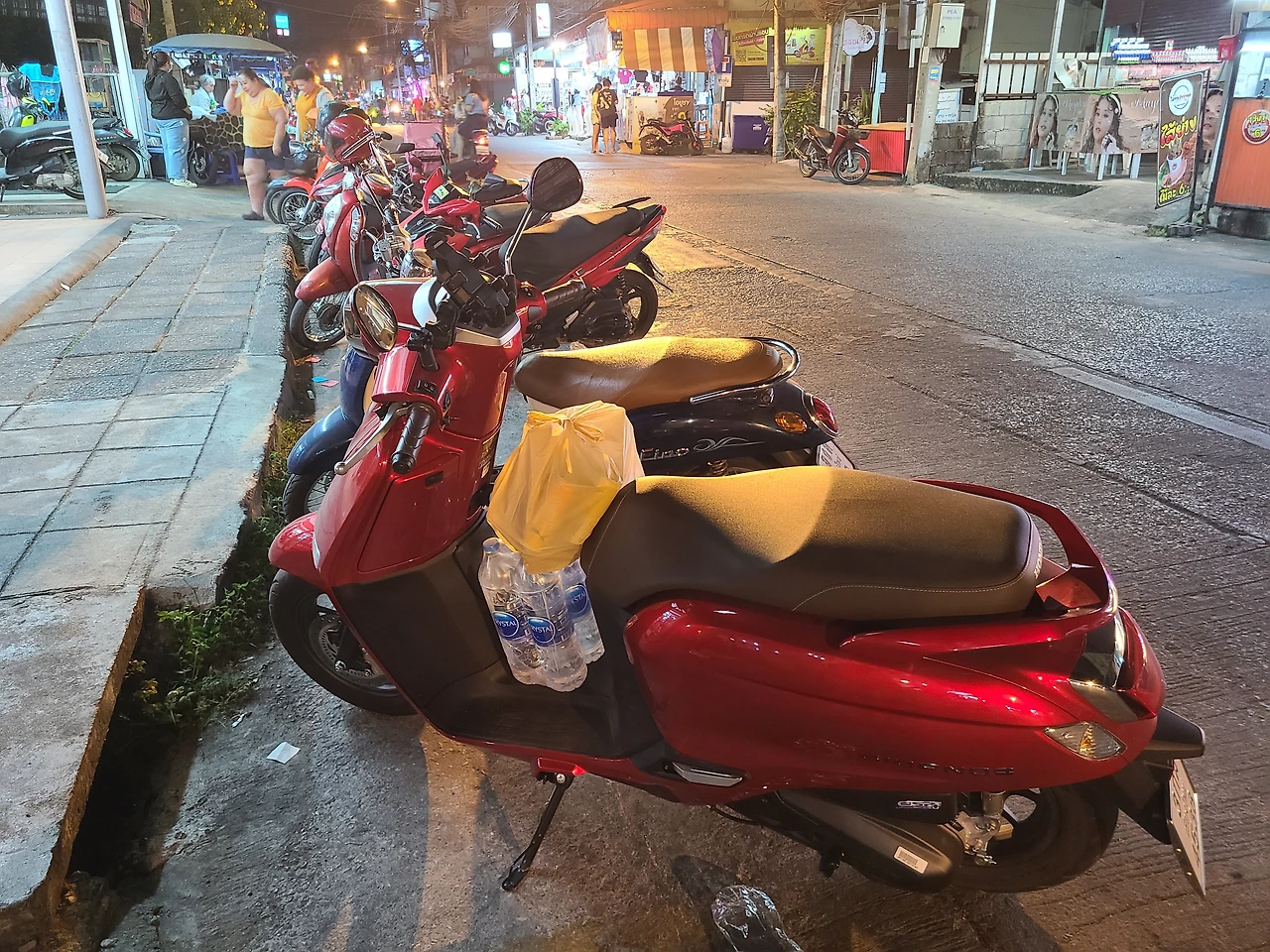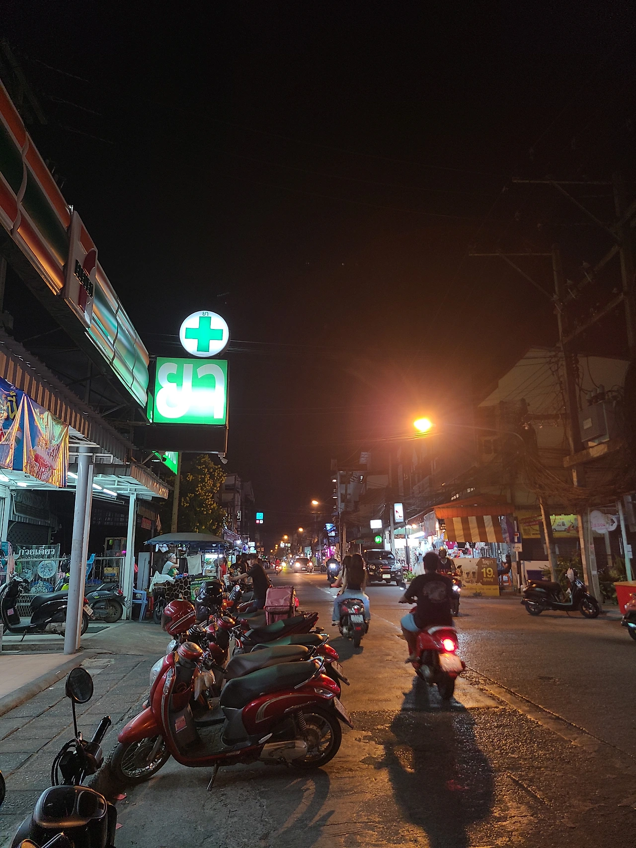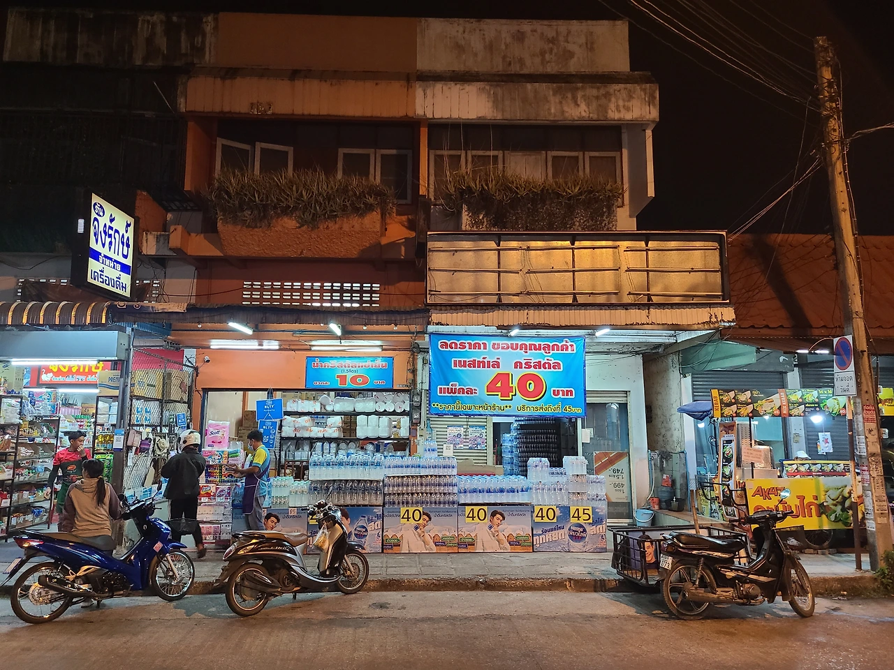 생수를 한 팩 사고 바로 앞에 있는 세븐일레븐에 들러서 6바트짜리 얼음 두 봉지, 제로 탄산 음료수 두 개, 아이스크림 하나를 샀다. 산 것을 오토바이에 싣고 보니 참으로 태국스럽다고 생각했다. 세븐일레븐이 보이는 풍경, 쉴 새 없이 지나가는 오토바이, 먼지 폴폴 풍겨가며 꼬치를 구워서 파는 노점들까지. 내가 생각하는 태국의 풍경이다.