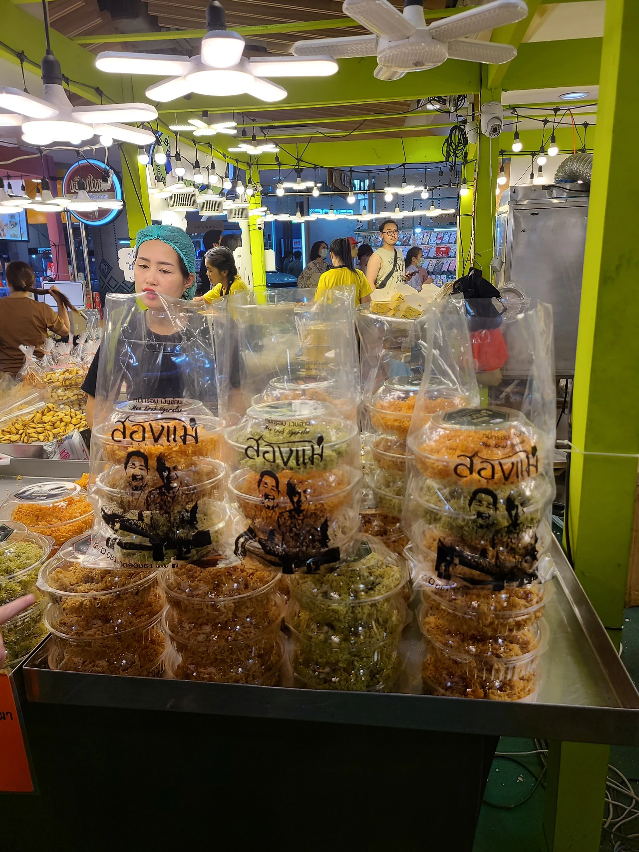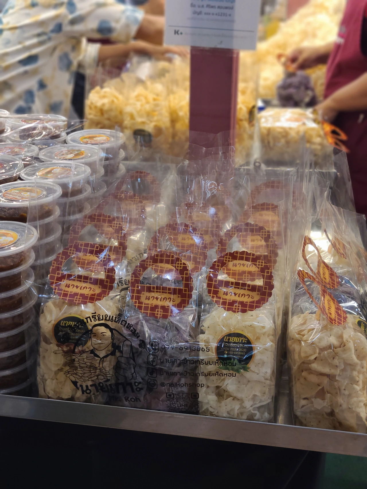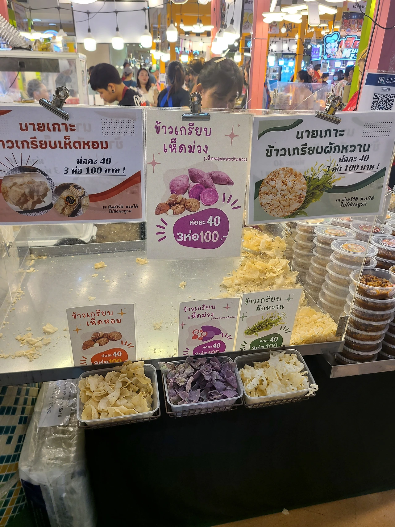 태국판 알새우칩 같은 과자로 쌀가루에 다양한 재료를 첨가해 얇게 튀겨낸다. 알새우칩보다는 얇고 아삭아삭 식감도 좋아서 주전부리로 먹기에 좋다. 아마 태국인들에게 인기 있는 맥주 안주가 아닐까. 태국식 양념장 같은 것에 찍어 먹는데 양념장 없이 먹어도 맛있었다. 3 봉지에 100바트 정도 했다.