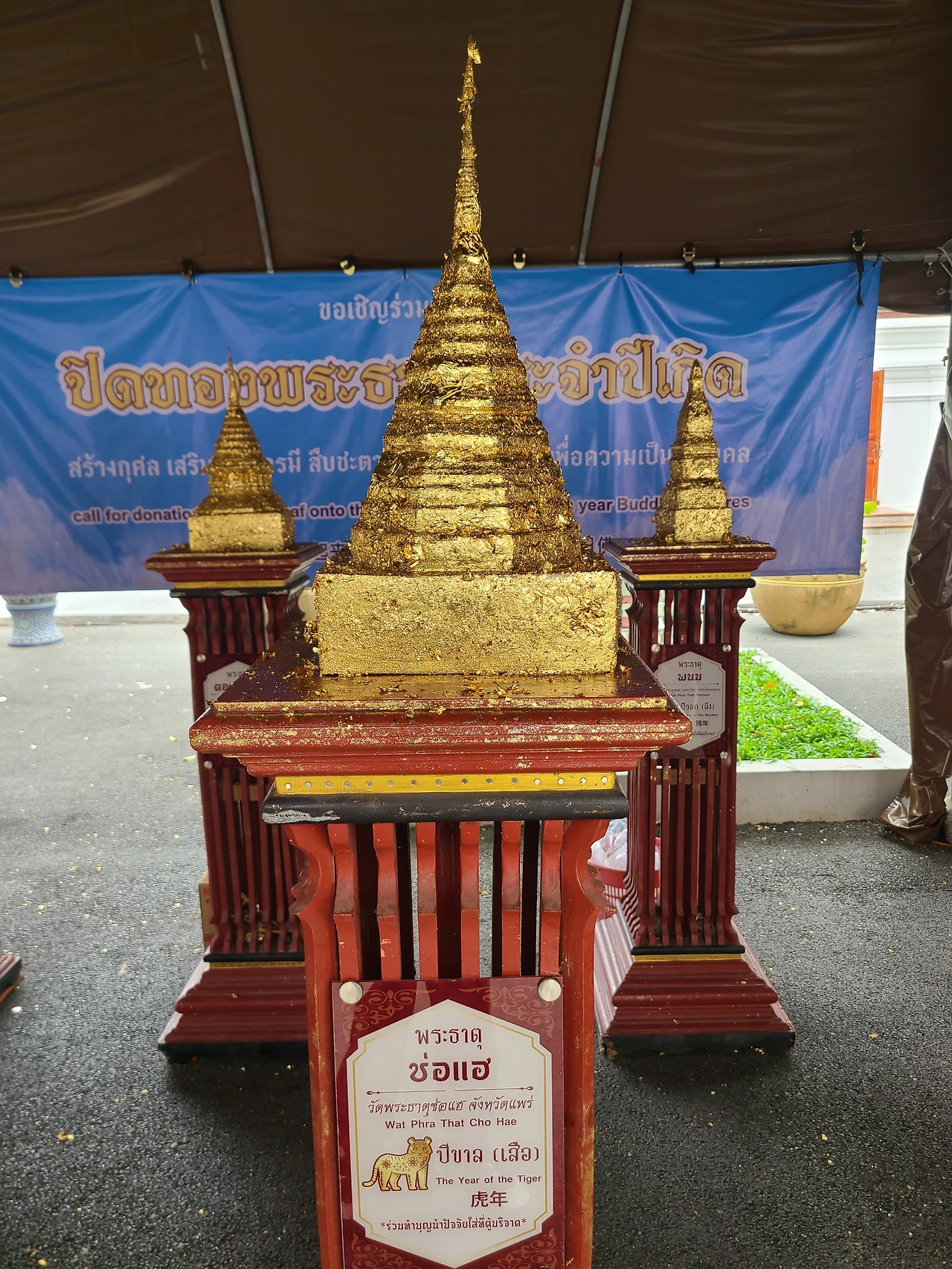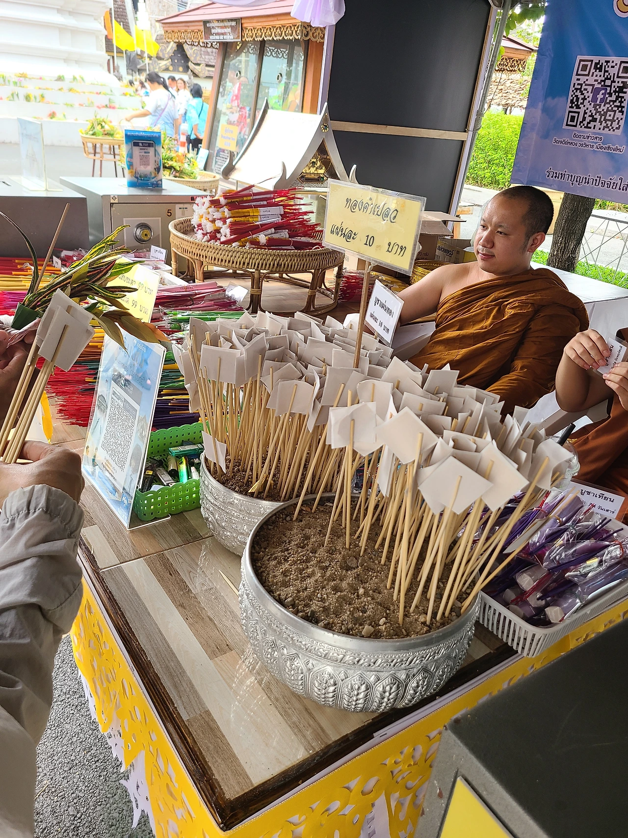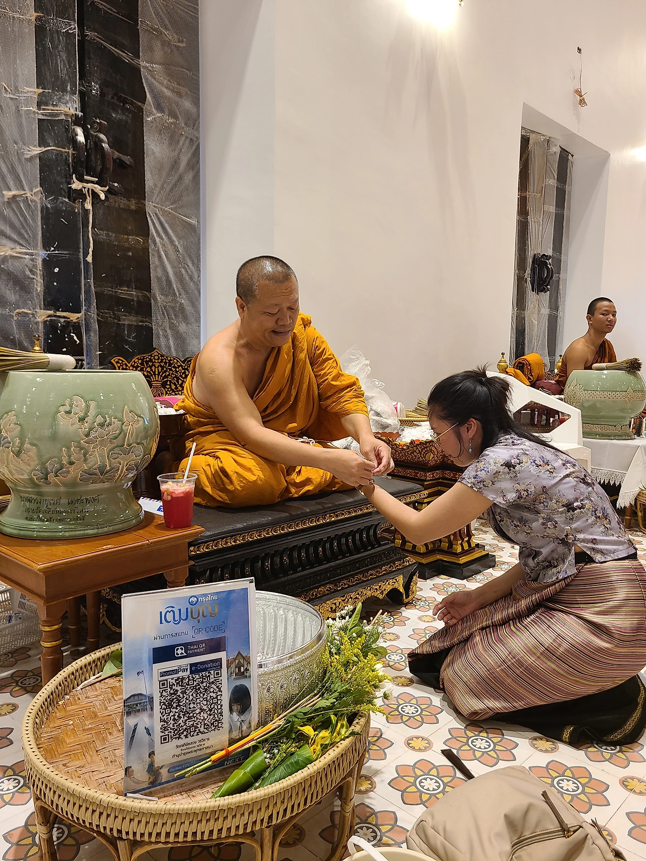 사당 투어를 마치고 본격적으로 사원을 둘러보는데 돈만 내면 할 수 있는 갖가지 '기도 이벤트 코스'가 마련되어 있었다. 비싸지 않기는 한데, 금박 같은 것을 사서 자신의 띠 혹은 자신이 태어난 요일의 조각상에 붙일 수도 있다. 이게 대체 불교랑 뭔 상관인가 싶었지만 재미있어 보여서 나도 해봤다. 사원의 메인 건물 안으로 들어가서는 스님에게 시주를 하고 스님의 축복을 받기도 했다. 스님은 손목에 실 같은 것을 묶어주신 후 법문을 읽어주셨다. 이 모든 것을 현금이 없어도 QR결제를 통해 할 수 있었다. 여성은 사당에 출입 금지인데 시주는 QR코드로 받다니. 과거와 현재가 이딴 식으로 공존하는 건가 싶어서 재미있었다.