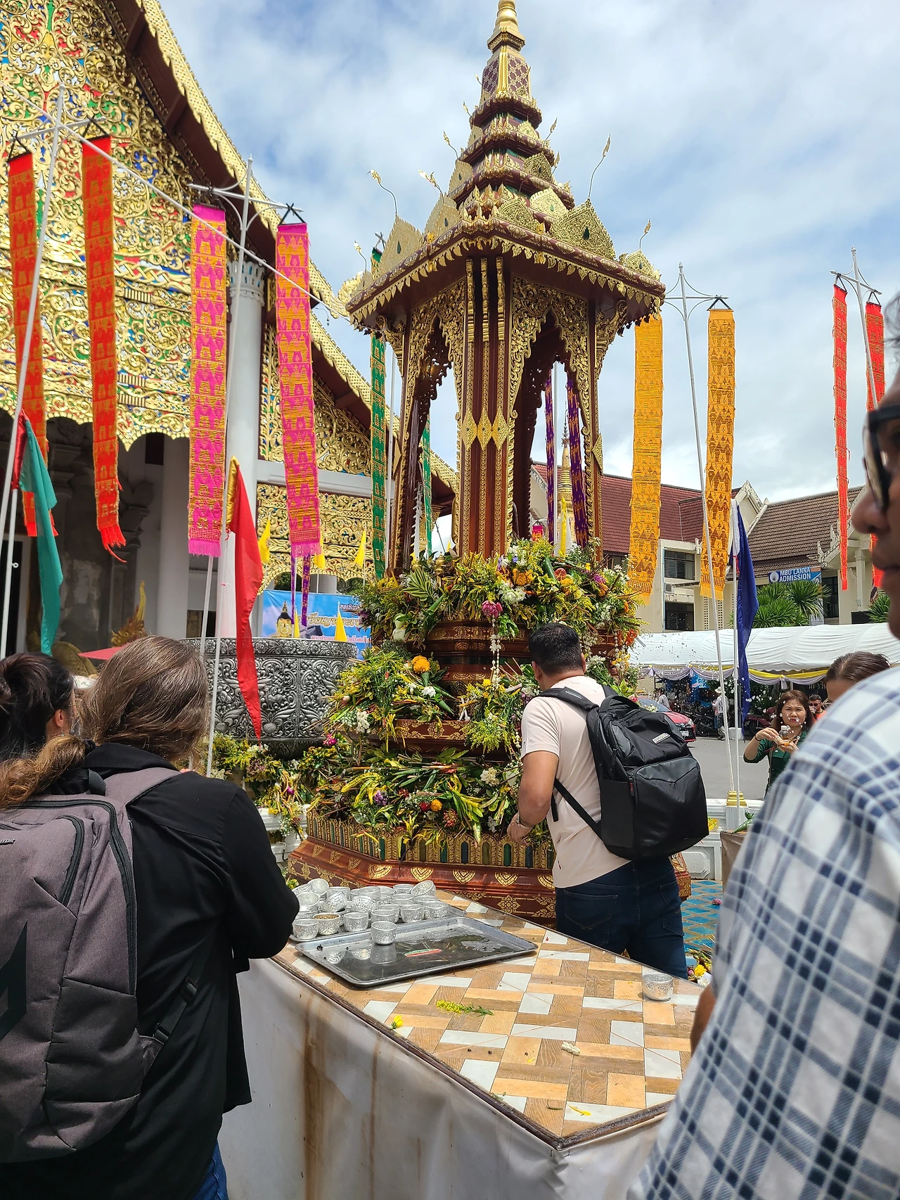 사원 앞에 도착하니 축제에 참여하려는 인파로 교통 체증이 발생할 정도였다. 동네의 유치원, 초등학교, 중학교 등등에서도 아이들이 단체로 많이 참여했는데 학생들을 통솔하는 선생님이 아이들에게 '덱덱'이라고 부르며 빨리 오라고 재촉하는 것을 보고 웃음이 났다. 덱덱은 어린아이를 뜻하는 태국어 단어다. 어감이 참 귀엽지 않나?