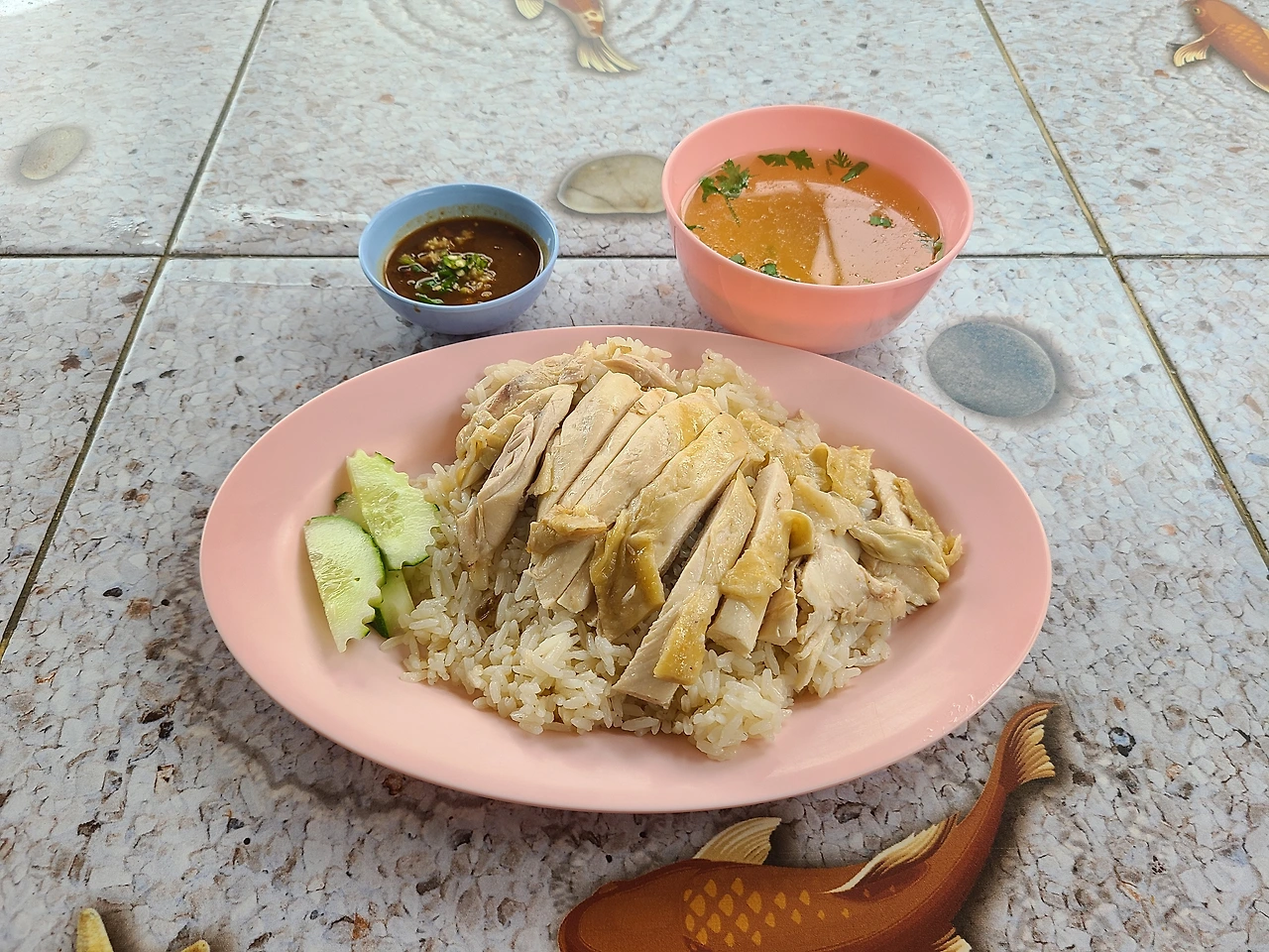 거창한 것은 아니고 태국식 삼계탕 비슷한 음식인 '카우만까이'를 먹었다. 닭고기 덮밥인데 함께 나오는 국물이 특히 삼계탕 국물 맛과 매우 흡사하다.