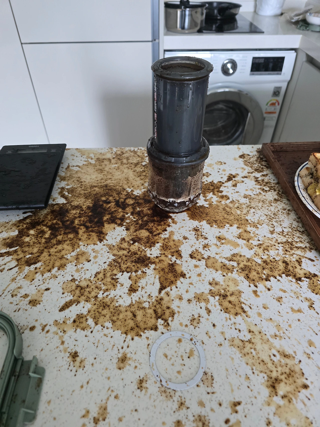 생각을 해보니 에어로프레스에 커피와 뜨거운 물을 담고 뚜껑 같은 걸 꽉 잠갔어야 했는데 그 단계에서 느슨하게 잠갔다는 생각이 들었다.