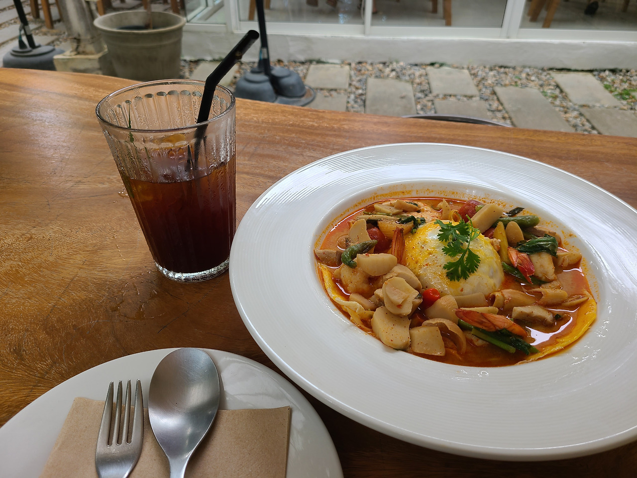 커피와 식사 하나를 시키고 우리 돈으로 만 원 정도를 지불했다. 커피 가격은 3천 원 즈음하는데 치앙마이 시내라면 100바트를 넘게 받아도 할 말이 없을 정도의 맛이었다. 음식은 똠얌 오믈렛이라고 똠얌꿍과 오믈렛이 함께 나오는 음식이었는데 이 먼 거리까지 스쿠터를 타고 달려온 피로를 잊게 해주는 맛이었다.
