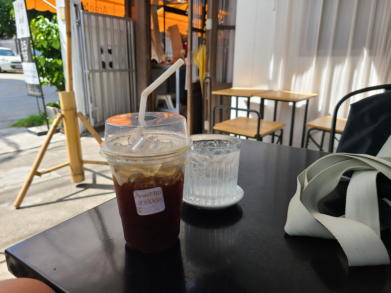 오토바이로 씨름을 하는 중간에 동네에서 또 기가 막힌 카페를 하나 발견했다. 저렴한 물가 때문에 장기 거주자들이 많은 싼티탐이라는 동네에 있는 카페다. 세상에, 아아 한 잔에 30바트라니. 가격표를 보고 두 눈을 의심했다.