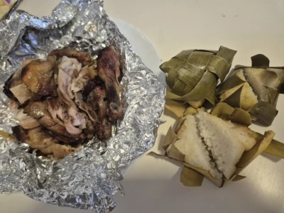 오늘의 아점은 테이크 아웃 통치킨구이다. 우리나라 전기구이 통닭 같은 느낌인데 나뭇잎에 싼 밥을 곁들여 먹는다.