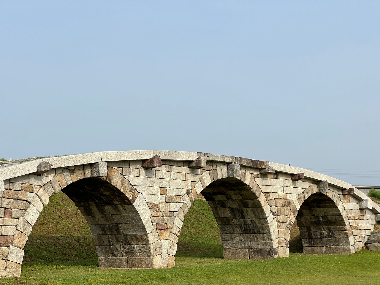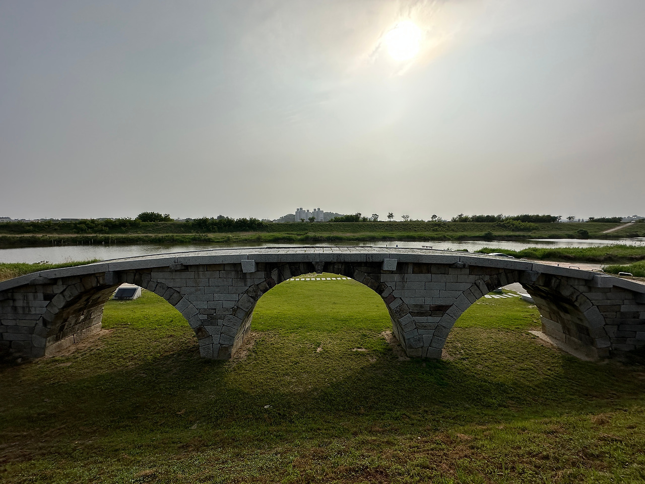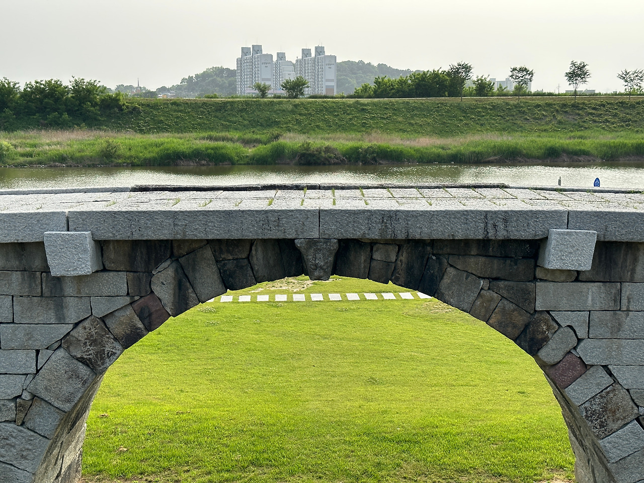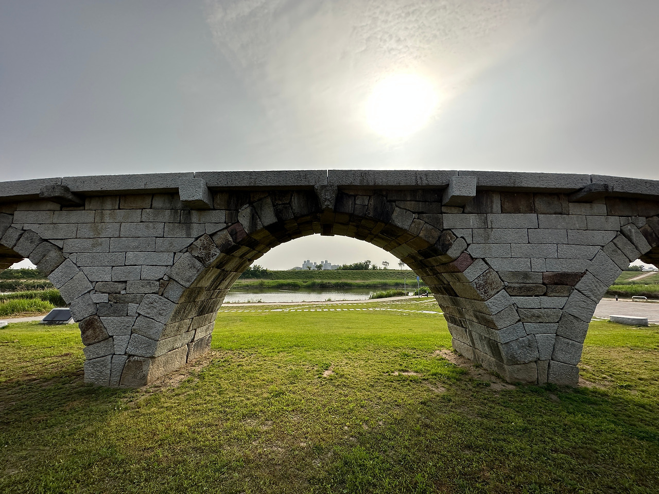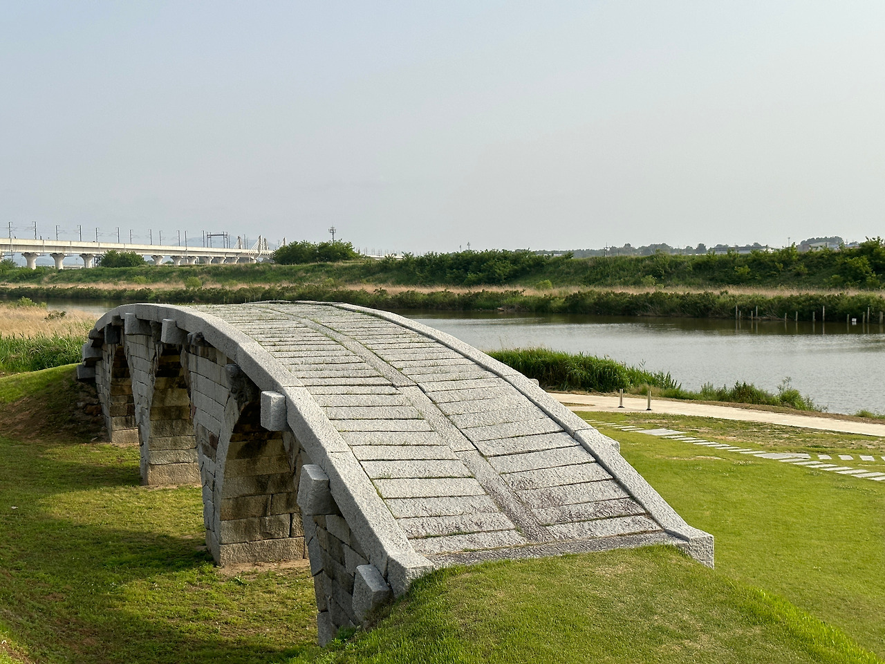 예상했던 것보다 훨씬 규모가 있고 정교해서 딱 보자마자 탄성이 절로 나오는 홍예교였다. 오후 햇살에 밝게 물든 강경천과 조화를 이루는 풍경도 너무나 인상 깊었다. 제방 제내지에 위치해 있어서 그런지 전체적으로 분위기가 매우 한적하고 평화로웠는데, 시간이 많다면 다리 앞 잔디밭에 돗자리를 깔고 가만히 앉아 강경천을 보며 멍 때리고 싶은 그런 곳이다. 강경미내다리의 아치에서 우러나오는 편안하고 자연스러운 우아함은 시간이 지나도 머릿속에서 떠나지 않을 것 같다.