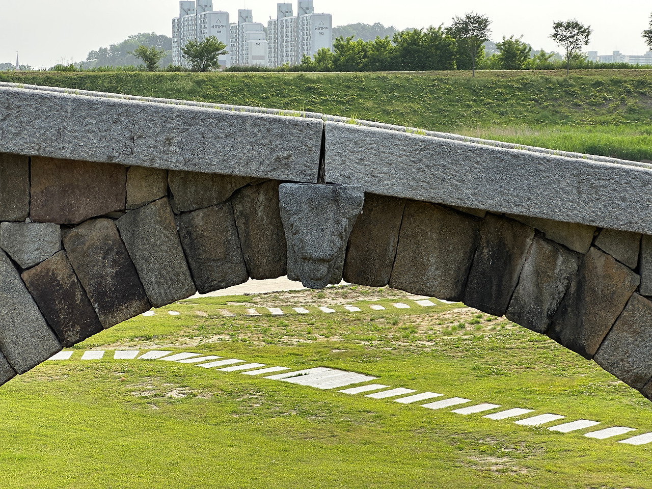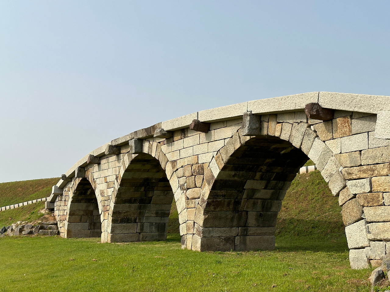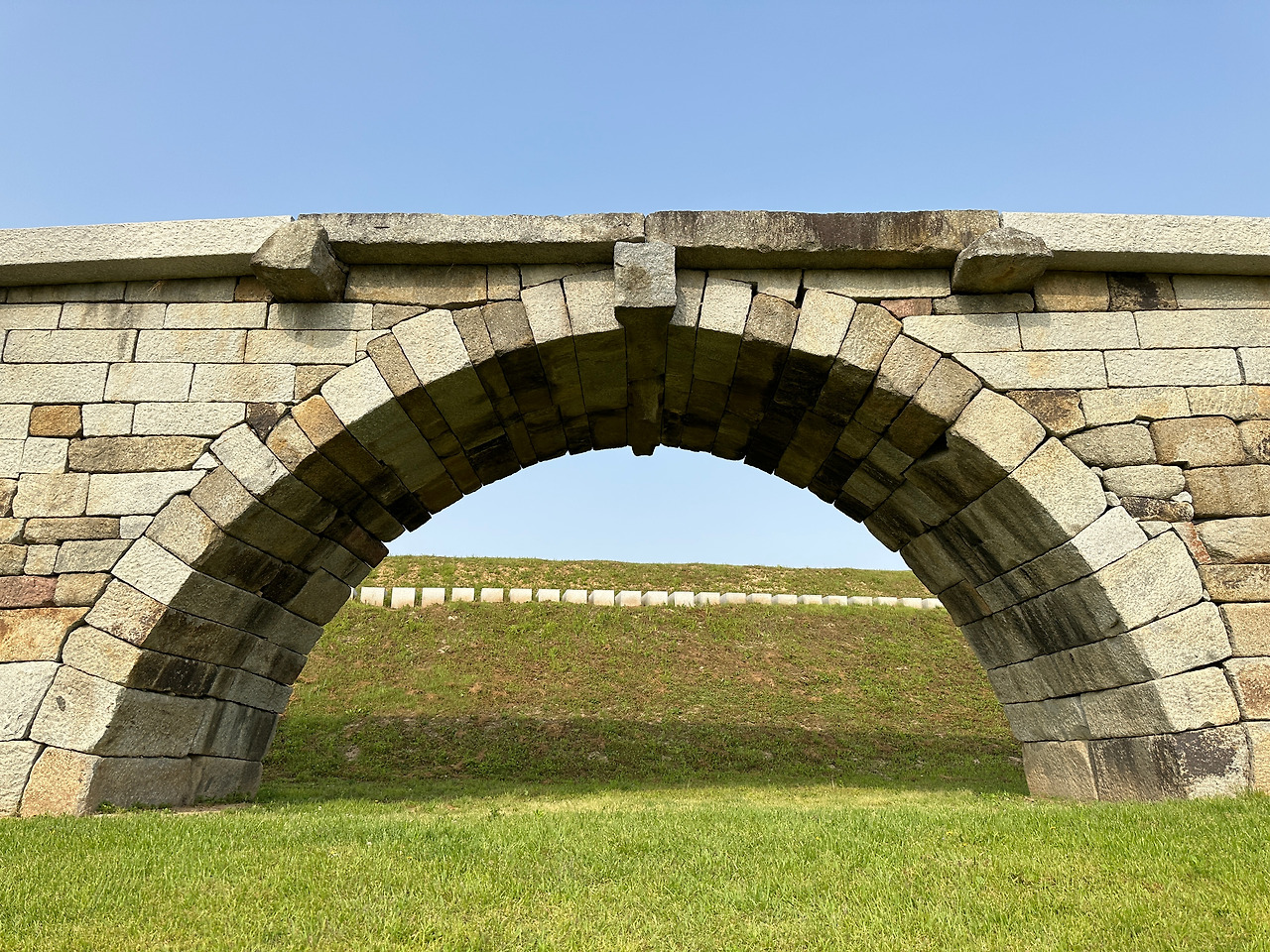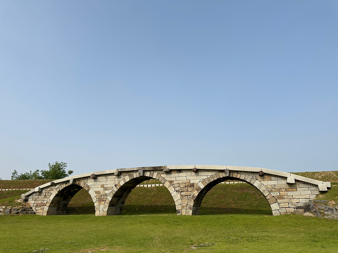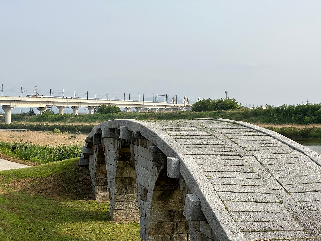 예상했던 것보다 훨씬 규모가 있고 정교해서 딱 보자마자 탄성이 절로 나오는 홍예교였다. 오후 햇살에 밝게 물든 강경천과 조화를 이루는 풍경도 너무나 인상 깊었다. 제방 제내지에 위치해 있어서 그런지 전체적으로 분위기가 매우 한적하고 평화로웠는데, 시간이 많다면 다리 앞 잔디밭에 돗자리를 깔고 가만히 앉아 강경천을 보며 멍 때리고 싶은 그런 곳이다. 강경미내다리의 아치에서 우러나오는 편안하고 자연스러운 우아함은 시간이 지나도 머릿속에서 떠나지 않을 것 같다.