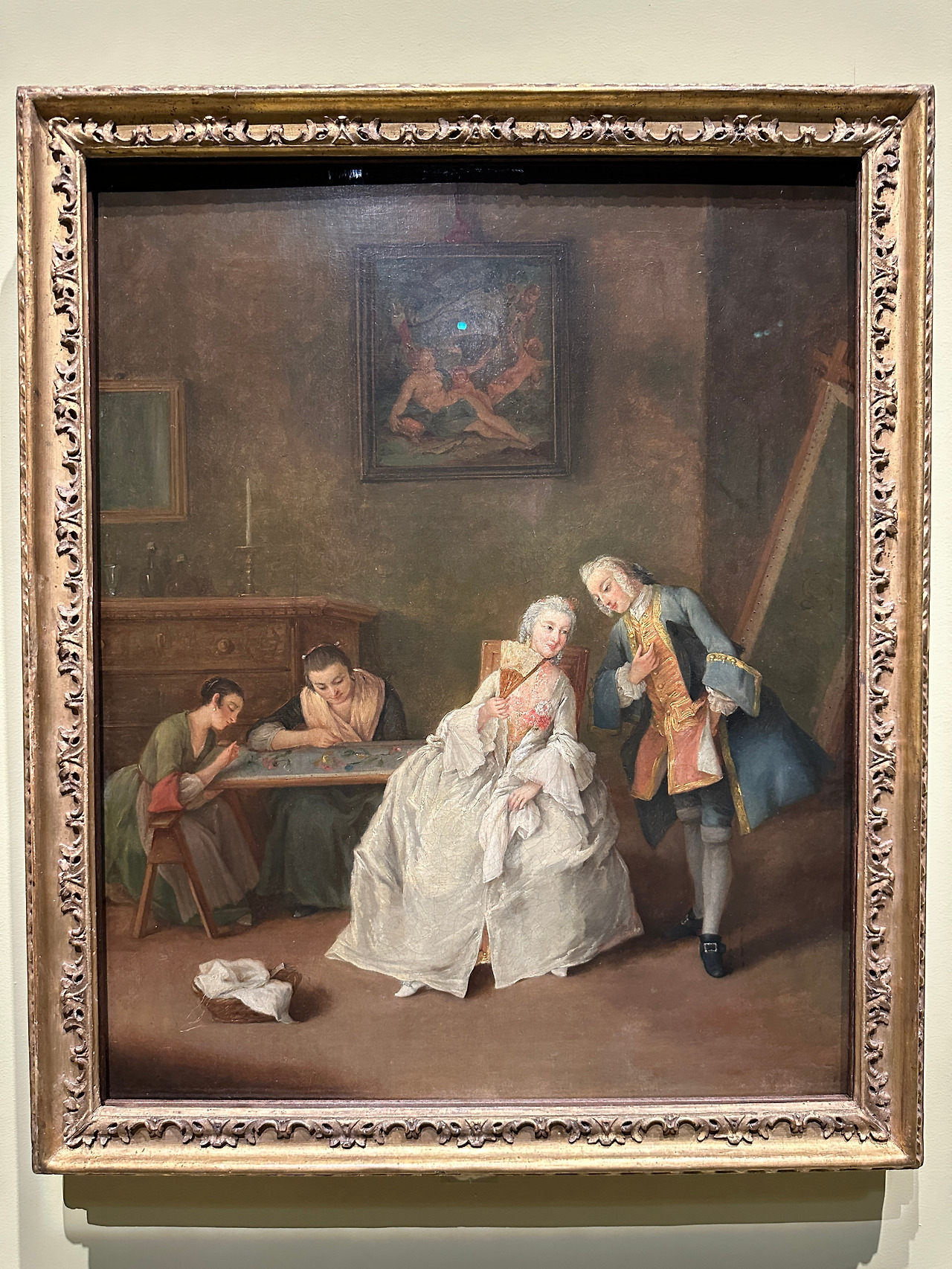 1715년 프랑스에서는 절대왕정의 정점을 찍었던 루이 14세가 사망하면서 절대왕정 체제가 흔들리고 귀족이 중요 세력으로 발돋움하면서 귀족적이고 화려하고 섬세하고 세련된 로코코 양식이 등장하게 된다. 그러나 이러한 로코코 양식에 대한 반발로 18세기 중반에는 영국과 유럽 모두에서 귀족(상류층)의 비도덕적 행동과 병폐를 풍자하는 그림이 유행하게 되는데, 이러한 경향의 대표적인 화가로는 영국의 윌리엄 호가스를 들 수 있다. 아쉽게도 윌리엄 호가스의 풍자화는 본 전시에 출품되지 않았지만, 본 전시에 출품된 피에트로 롱기의 그림 1점이 이러한 풍자적 경향을 잘 보여주고 있다.
