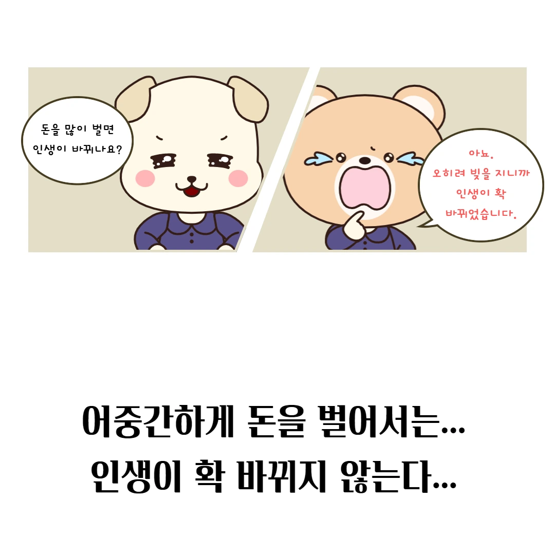 (사업가): "그런데 과거에 동업자와 계약을 잘못하는 바람에 빚을 3천만 원가량 진적이 있었어요. 그랬더니 인생이 바뀌더라고요. 돈을 많이 벌 때는 인생이 바뀌지 않는데, 빚을 지니까 인생이 확실히 바뀌는 것 같아요."